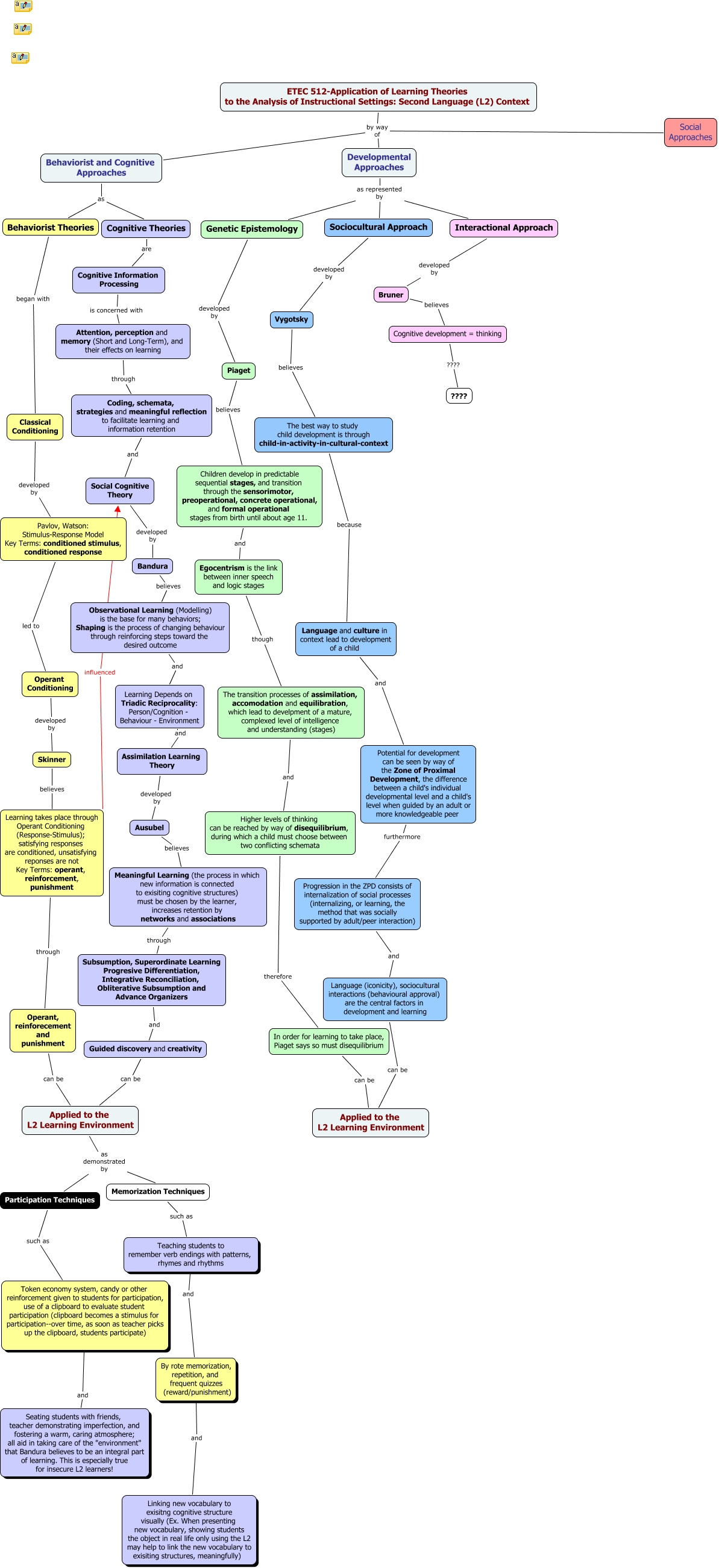 This Concept Map, created with IHMC CmapTools, has information related to: ETEC 512 Content- Draft 2, Piaget developed by Genetic Epistemology, Classical Conditioning developed by Pavlov, Watson: Stimulus-Response Model Key Terms: conditioned stimulus, conditioned response, Bruner developed by Interactional Approach, Applied to the L2 Learning Environment can be Language (iconicity), sociocultural interactions (behavioural approval) are the central factors in development and learning, Pavlov, Watson: Stimulus-Response Model Key Terms: conditioned stimulus, conditioned response led to Operant Conditioning, Applied to the L2 Learning Environment as demonstrated by Participation Techniques, By rote memorization, repetition, and frequent quizzes (reward/punishment) and Linking new vocabulary to exisitng cognitive structure visually (Ex. When presenting new vocabulary, showing students the object in real life only using the L2 may help to link the new vocabulary to exisiting structures, meaningfully), Teaching students to remember verb endings with patterns, rhymes and rhythms and By rote memorization, repetition, and frequent quizzes (reward/punishment), Developmental Approaches by way of Social Approaches, Learning takes place through Operant Conditioning (Response-Stimulus); satisfying responses are conditioned, unsatisfying reponses are not Key Terms: operant, reinforcement, punishment influenced Social Cognitive Theory, Developmental Approaches by way of ETEC 512-Application of Learning Theories to the Analysis of Instructional Settings: Second Language (L2) Context, Applied to the L2 Learning Environment can be In order for learning to take place, Piaget says so must disequilibrium, Developmental Approaches by way of Behaviorist and Cognitive Approaches, Cognitive Theories are Cognitive Information Processing, Cognitive Information Processing is concerned with Attention, perception and memory (Short and Long-Term), and their effects on learning, The transition processes of assimilation, accomodation and equilibration, which lead to develpment of a mature, complexed level of intelligence and understanding (stages) and Higher levels of thinking can be reached by way of disequilibrium, during which a child must choose between two conflicting schemata, Ausubel believes Meaningful Learning (the process in which new information is connected to exisiting cognitive structures) must be chosen by the learner, increases retention by networks and associations, Higher levels of thinking can be reached by way of disequilibrium, during which a child must choose between two conflicting schemata therefore In order for learning to take place, Piaget says so must disequilibrium, Coding, schemata, strategies and meaningful reflection to facilitate learning and information retention and Social Cognitive Theory, Attention, perception and memory (Short and Long-Term), and their effects on learning through Coding, schemata, strategies and meaningful reflection to facilitate learning and information retention