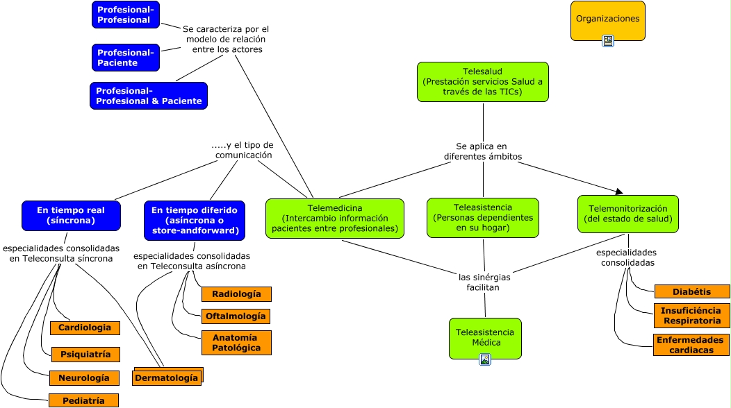 Este Cmap, tiene información relacionada con: TeleSalud, Oftalmología especialidades consolidadas en Teleconsulta asíncrona En tiempo diferido (asíncrona o store-andforward), Dermatología especialidades consolidadas en Teleconsulta asíncrona En tiempo diferido (asíncrona o store-andforward), Pediatría especialidades consolidadas en Teleconsulta síncrona En tiempo real (síncrona), Psiquiatría especialidades consolidadas en Teleconsulta síncrona En tiempo real (síncrona), Diabétis especialidades consolidadas Telemonitorización (del estado de salud), Radiología especialidades consolidadas en Teleconsulta asíncrona En tiempo diferido (asíncrona o store-andforward), En tiempo diferido (asíncrona o store-andforward) .....y el tipo de comunicación Telemedicina (Intercambio información pacientes entre profesionales), Enfermedades cardiacas especialidades consolidadas Telemonitorización (del estado de salud), Dermatología especialidades consolidadas en Teleconsulta síncrona En tiempo real (síncrona), Cardiologia especialidades consolidadas en Teleconsulta síncrona En tiempo real (síncrona), Telesalud (Prestación servicios Salud a través de las TICs) Se aplica en diferentes ámbitos Teleasistencia (Personas dependientes en su hogar), Teleasistencia Médica las sinérgias facilitan Telemedicina (Intercambio información pacientes entre profesionales), Profesional- Profesional Se caracteriza por el modelo de relación entre los actores Telemedicina (Intercambio información pacientes entre profesionales), Neurología especialidades consolidadas en Teleconsulta síncrona En tiempo real (síncrona), Teleasistencia Médica las sinérgias facilitan Teleasistencia (Personas dependientes en su hogar), Profesional- Paciente Se caracteriza por el modelo de relación entre los actores Telemedicina (Intercambio información pacientes entre profesionales), En tiempo real (síncrona) .....y el tipo de comunicación Telemedicina (Intercambio información pacientes entre profesionales), Profesional- Profesional & Paciente Se caracteriza por el modelo de relación entre los actores Telemedicina (Intercambio información pacientes entre profesionales), Anatomía Patológica especialidades consolidadas en Teleconsulta asíncrona En tiempo diferido (asíncrona o store-andforward), Insuficiéncia Respiratoria especialidades consolidadas Telemonitorización (del estado de salud)