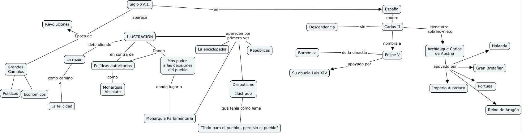 Este mapa conceptual tiene información relacionada a: 17. Francisco León Zacarías. S XVIII, Carlos II tiene otro sobrino-nieto Archiduque Carlos de Austria, Felipe V de la dinastía Borbónica, Archiduque Carlos de Austria apoyado por Holanda, Archiduque Carlos de Austria apoyado por Imperio Austriaco, Siglo XVIII Epoca de Grandes Cambios, Siglo XVIII en España, ILUSTRACIÓN aparecen por primera vez Despotismo Ilustrado, Archiduque Carlos de Austria apoyado por Reino de Aragón, Siglo XVIII Epoca de Revoluciones, Más poder a las decisiones del pueblo dando lugar a Monarquía Parlamentaria