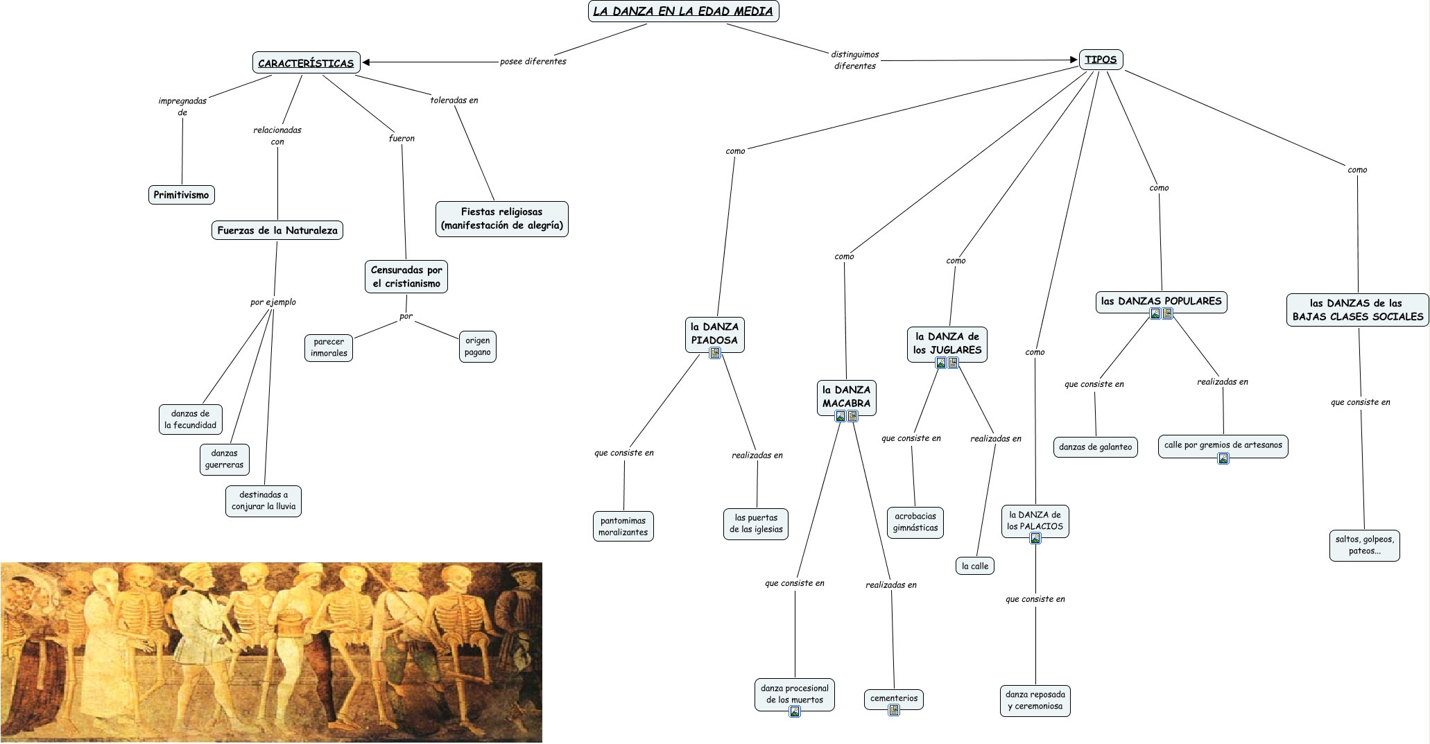 Este Cmap, tiene información relacionada con: edad media, Fuerzas de la Naturaleza por ejemplo danzas guerreras, las DANZAS POPULARES que consiste en danzas de galanteo, LA DANZA EN LA EDAD MEDIA distinguimos diferentes TIPOS, las DANZAS de las BAJAS CLASES SOCIALES que consiste en saltos, golpeos, pateos..., la DANZA PIADOSA que consiste en pantomimas moralizantes, las DANZAS POPULARES realizadas en calle por gremios de artesanos, TIPOS como la DANZA MACABRA, CARACTERÍSTICAS relacionadas con Fuerzas de la Naturaleza, Censuradas por el cristianismo por origen pagano, TIPOS como la DANZA PIADOSA, TIPOS como la DANZA de los JUGLARES, la DANZA PIADOSA realizadas en las puertas de las iglesias, CARACTERÍSTICAS fueron Censuradas por el cristianismo, Fuerzas de la Naturaleza por ejemplo destinadas a conjurar la lluvia, Fuerzas de la Naturaleza por ejemplo danzas de la fecundidad, la DANZA MACABRA realizadas en cementerios, Censuradas por el cristianismo por parecer inmorales, la DANZA de los JUGLARES que consiste en acrobacias gimnásticas, la DANZA de los JUGLARES realizadas en la calle, la DANZA de los PALACIOS que consiste en danza reposada y ceremoniosa
