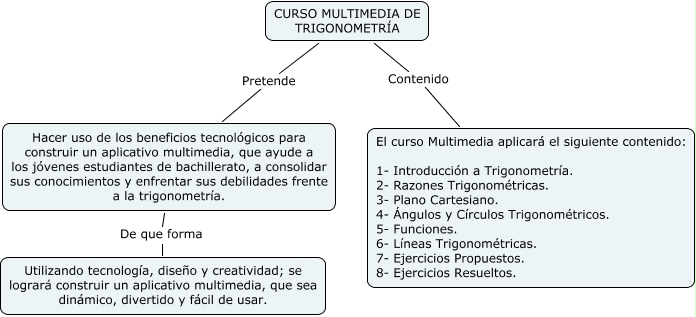 Este Cmap, tiene información relacionada con: CM-fagace-CursoTrigonometria, Hacer uso de los beneficios tecnológicos para construir un aplicativo multimedia, que ayude a los jóvenes estudiantes de bachillerato, a consolidar sus conocimientos y enfrentar sus debilidades frente a la trigonometría. De que forma Utilizando tecnología, diseño y creatividad; se logrará construir un aplicativo multimedia, que sea dinámico, divertido y fácil de usar., CURSO MULTIMEDIA DE TRIGONOMETRÍA Contenido El curso Multimedia aplicará el siguiente contenido: 1- Introducción a Trigonometría. 2- Razones Trigonométricas. 3- Plano Cartesiano. 4- Ángulos y Círculos Trigonométricos. 5- Funciones. 6- Líneas Trigonométricas. 7- Ejercicios Propuestos. 8- Ejercicios Resueltos., CURSO MULTIMEDIA DE TRIGONOMETRÍA Pretende Hacer uso de los beneficios tecnológicos para construir un aplicativo multimedia, que ayude a los jóvenes estudiantes de bachillerato, a consolidar sus conocimientos y enfrentar sus debilidades frente a la trigonometría.