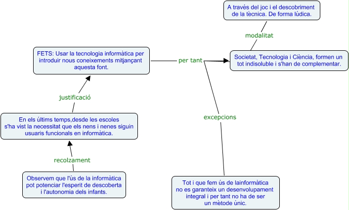 Aquest mapa conceptual conté informació relacionada amb: a-map TOULMIN, Observem que l'ús de la informàtica pot potenciar l'esperit de descoberta i l'autonomia dels infants. recolzament En els últims temps,desde les escoles s'ha vist la necessitat que els nens i nenes siguin usuaris funcionals en informàtica., En els últims temps,desde les escoles s'ha vist la necessitat que els nens i nenes siguin usuaris funcionals en informàtica. justificació FETS: Usar la tecnologia informàtica per introduir nous coneixements mitjançant aquesta font., A través del joc i el descobriment de la tècnica. De forma lúdica. modalitat ????, FETS: Usar la tecnologia informàtica per introduir nous coneixements mitjançant aquesta font. per tant Societat, Tecnologia i Ciència, formen un tot indisoluble i s'han de complementar., Tot i que fem ús de lainformàtica no es garanteix un desenvolupament integral i per tant no ha de ser un mètode únic. excepcions ????