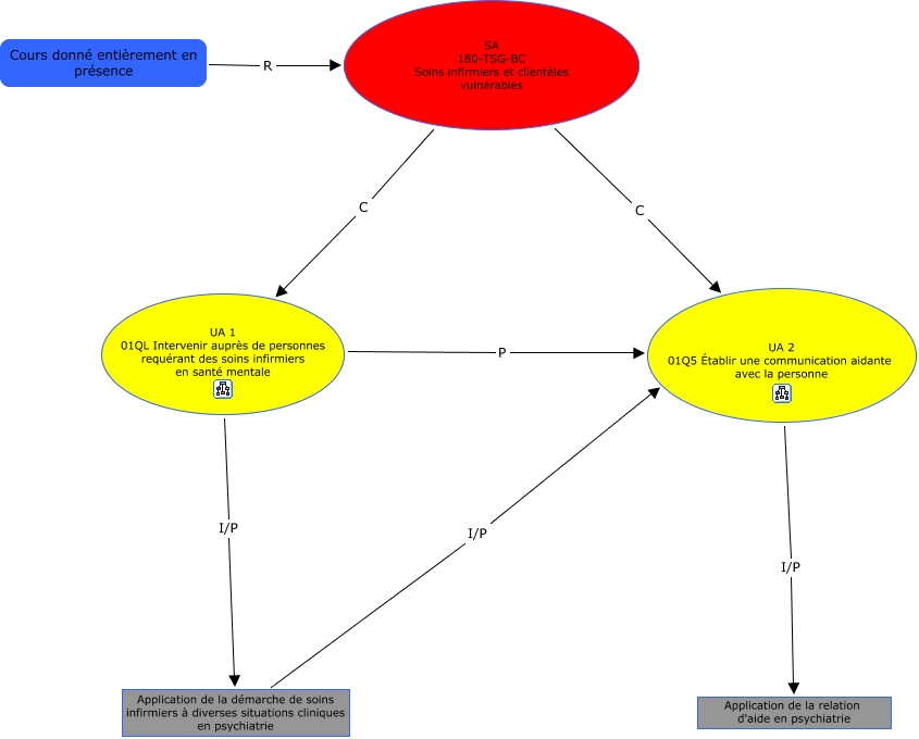 Cette carte conceptuelle, cree avec IHMC CmapTools, contient des informations liees a : SA, Cours donné entièrement en présence R SA 180-TSG-BC Soins infirmiers et clientèles vulnérables, SA 180-TSG-BC Soins infirmiers et clientèles vulnérables C UA 1 01QL Intervenir auprès de personnes requérant des soins infirmiers en santé mentale, UA 1 01QL Intervenir auprès de personnes requérant des soins infirmiers en santé mentale P UA 2 01Q5 Établir une communication aidante avec la personne, UA 1 01QL Intervenir auprès de personnes requérant des soins infirmiers en santé mentale I/P Application de la démarche de soins infirmiers à diverses situations cliniques en psychiatrie, SA 180-TSG-BC Soins infirmiers et clientèles vulnérables C UA 2 01Q5 Établir une communication aidante avec la personne, UA 2 01Q5 Établir une communication aidante avec la personne I/P Application de la relation d'aide en psychiatrie, Application de la démarche de soins infirmiers à diverses situations cliniques en psychiatrie I/P UA 2 01Q5 Établir une communication aidante avec la personne