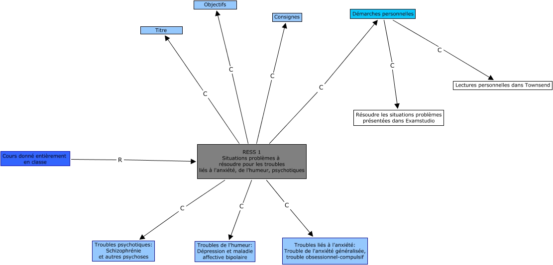 Cette carte conceptuelle, cree avec IHMC CmapTools, contient des informations liees a : RESS 1, Démarches personnelles C Lectures personnelles dans Townsend, RESS 1 Situations problèmes à résoudre pour les troubles liés à l'anxiété, de l'humeur, psychotiques C Démarches personnelles, Cours donné entièrement en classe R RESS 1 Situations problèmes à résoudre pour les troubles liés à l'anxiété, de l'humeur, psychotiques, RESS 1 Situations problèmes à résoudre pour les troubles liés à l'anxiété, de l'humeur, psychotiques C Objectifs, RESS 1 Situations problèmes à résoudre pour les troubles liés à l'anxiété, de l'humeur, psychotiques C Consignes, RESS 1 Situations problèmes à résoudre pour les troubles liés à l'anxiété, de l'humeur, psychotiques C Titre, Démarches personnelles C Résoudre les situations problèmes présentées dans Examstudio, RESS 1 Situations problèmes à résoudre pour les troubles liés à l'anxiété, de l'humeur, psychotiques C Troubles psychotiques: Schizophrénie et autres psychoses, RESS 1 Situations problèmes à résoudre pour les troubles liés à l'anxiété, de l'humeur, psychotiques C Troubles liés à l'anxiété: Trouble de l'anxiété généralisée, trouble obsessionnel-compulsif