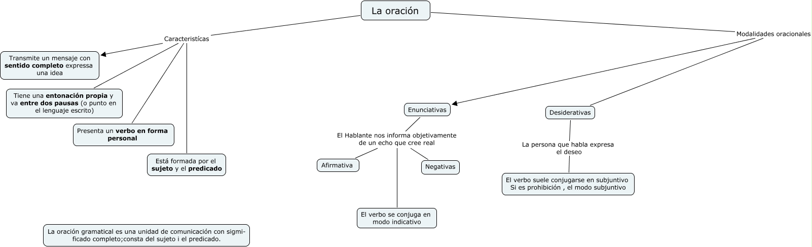 Este Cmap, tiene información relacionada con: Sin Título 1, La oración Modalidades oracionales Desiderativas, La oración Caracteristícas Tiene una entonación propia y va entre dos pausas (o punto en el lenguaje escrito), La oración Caracteristícas Presenta un verbo en forma personal, La oración Caracteristícas Transmite un mensaje con sentido completo expressa una idea, Enunciativas El Hablante nos informa objetivamente de un echo que cree real Afirmativa, La oración Modalidades oracionales Enunciativas, Enunciativas El Hablante nos informa objetivamente de un echo que cree real Negativas, Desiderativas La persona que habla expresa el deseo El verbo suele conjugarse en subjuntivo Si es prohibición , el modo subjuntivo, Enunciativas El Hablante nos informa objetivamente de un echo que cree real El verbo se conjuga en modo indicativo, La oración Caracteristícas Está formada por el sujeto y el predicado