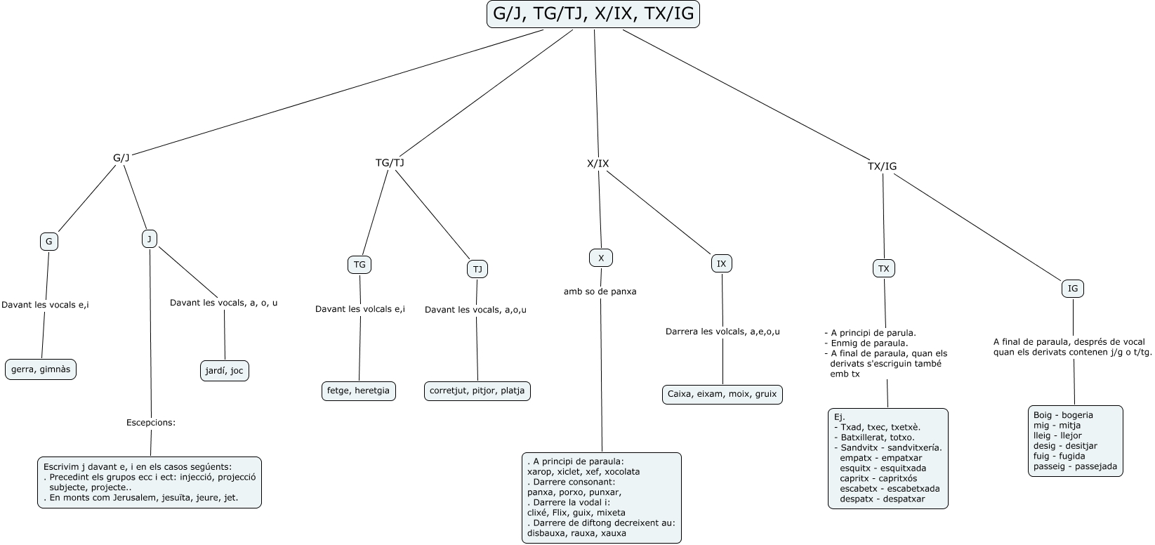 Este Cmap, tiene información relacionada con: cat tema 9 pag 216, G/J, TG/TJ, X/IX, TX/IG G/J G, TG Davant les volcals e,i fetge, heretgia, IG A final de paraula, després de vocal quan els derivats contenen j/g o t/tg. Boig - bogeria mig - mitja lleig - llejor desig - desitjar fuig - fugida passeig - passejada, G/J, TG/TJ, X/IX, TX/IG TG/TJ TG, G/J, TG/TJ, X/IX, TX/IG TG/TJ TJ, G/J, TG/TJ, X/IX, TX/IG X/IX X, G Davant les vocals e,i gerra, gimnàs, G/J, TG/TJ, X/IX, TX/IG TX/IG TX, G/J, TG/TJ, X/IX, TX/IG X/IX IX, TX - A principi de parula. - Enmig de paraula. - A final de paraula, quan els derivats s'escriguin també emb tx Ej. - Txad, txec, txetxè. - Batxillerat, totxo. - Sandvitx - sandvitxería. empatx - empatxar esquitx - esquitxada capritx - capritxós escabetx - escabetxada despatx - despatxar, J Escepcions: Escrivim j davant e, i en els casos segúents: . Precedint els grupos ecc i ect: injecció, projecció subjecte, projecte.. . En monts com Jerusalem, jesuïta, jeure, jet., X amb so de panxa . A principi de paraula: xarop, xiclet, xef, xocolata . Darrere consonant: panxa, porxo, punxar, . Darrere la vodal i: clixé, Flix, guix, mixeta . Darrere de diftong decreixent au: disbauxa, rauxa, xauxa, J Davant les vocals, a, o, u jardí, joc, G/J, TG/TJ, X/IX, TX/IG TX/IG IG, G/J, TG/TJ, X/IX, TX/IG G/J J, TJ Davant les vocals, a,o,u corretjut, pitjor, platja, IX Darrera les volcals, a,e,o,u Caixa, eixam, moix, gruix