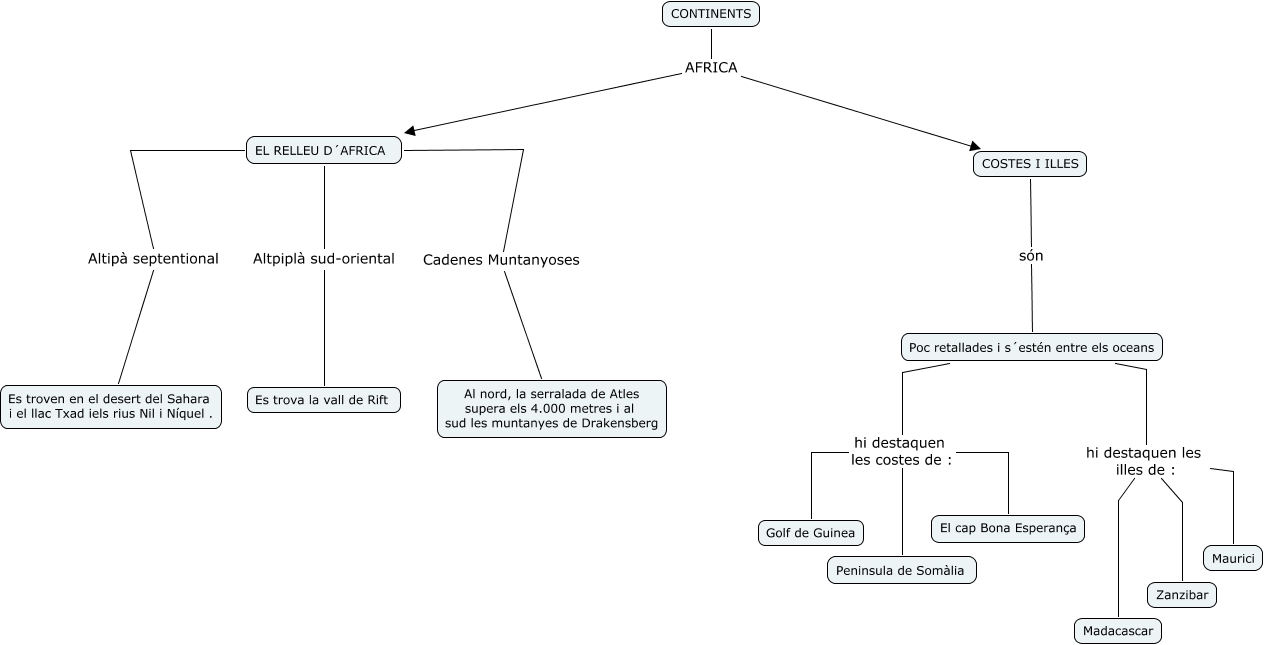 Este Cmap, tiene información relacionada con: Africa, EL RELLEU D´AFRICA Altipà septentional Es troven en el desert del Sahara i el llac Txad iels rius Nil i Níquel ., EL RELLEU D´AFRICA Altpiplà sud-oriental Es trova la vall de Rift, COSTES I ILLES són Poc retallades i s´estén entre els oceans, Poc retallades i s´estén entre els oceans hi destaquen les illes de : Zanzibar, Poc retallades i s´estén entre els oceans hi destaquen les illes de : Maurici, CONTINENTS AFRICA COSTES I ILLES, Poc retallades i s´estén entre els oceans hi destaquen les costes de : Golf de Guinea, Poc retallades i s´estén entre els oceans hi destaquen les costes de : Peninsula de Somàlia, EL RELLEU D´AFRICA Cadenes Muntanyoses Al nord, la serralada de Atles supera els 4.000 metres i al sud les muntanyes de Drakensberg, CONTINENTS AFRICA EL RELLEU D´AFRICA, Poc retallades i s´estén entre els oceans hi destaquen les costes de : El cap Bona Esperança, Poc retallades i s´estén entre els oceans hi destaquen les illes de : Madacascar