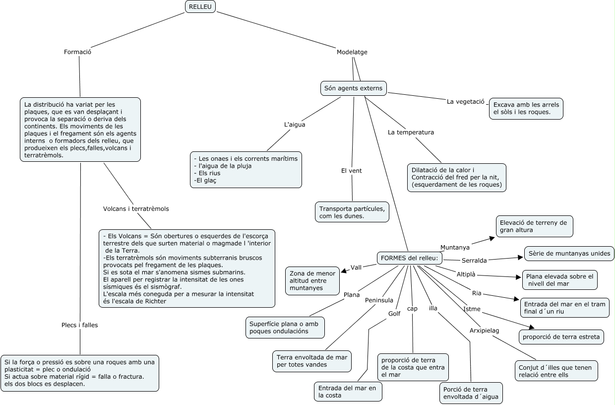 Este Cmap, tiene información relacionada con: soc 2, RELLEU Modelatge Són agents externs, FORMES del relleu: Serralda Sèrie de muntanyas unides, FORMES del relleu: Istme proporció de terra estreta, FORMES del relleu: Ria Entrada del mar en el tram final d´un riu, Són agents externs El vent Transporta partícules, com les dunes., Són agents externs L'aigua - Les onaes i els corrents marítims - l'aigua de la pluja - Els rius -El glaç, La distribució ha variat per les plaques, que es van desplaçant i provoca la separació o deriva dels continents. Els moviments de les plaques i el fregament són els agents interns o formadors dels relleu, que produeixen els plecs,falles,volcans i terratrèmols. Volcans i terratrèmols - Els Volcans = Són obertures o esquerdes de l'escorça terrestre dels que surten material o magmade l 'interior de la Terra. -Els terratrèmols són moviments subterranis bruscos provocats pel fregament de les plaques. Si es sota el mar s'anomena sismes submarins. El aparell per registrar la intensitat de les ones sísmiques és el sismògraf. L'escala més coneguda per a mesurar la intensitat és l'escala de Richter, La distribució ha variat per les plaques, que es van desplaçant i provoca la separació o deriva dels continents. Els moviments de les plaques i el fregament són els agents interns o formadors dels relleu, que produeixen els plecs,falles,volcans i terratrèmols. Plecs i falles Si la força o pressió es sobre una roques amb una plasticitat = plec o ondulació Si actua sobre material rígid = falla o fractura. els dos blocs es desplacen., RELLEU Modelatge FORMES del relleu:, FORMES del relleu: cap proporció de terra de la costa que entra el mar, FORMES del relleu: illa Porció de terra envoltada d´aigua, RELLEU Formació La distribució ha variat per les plaques, que es van desplaçant i provoca la separació o deriva dels continents. Els moviments de les plaques i el fregament són els agents interns o formadors dels relleu, que produeixen els plecs,falles,volcans i terratrèmols., FORMES del relleu: Vall Zona de menor altitud entre muntanyes, FORMES del relleu: Golf Entrada del mar en la costa, Són agents externs La vegetació Excava amb les arrels el sòls i les roques., FORMES del relleu: Altiplà Plana elevada sobre el nivell del mar, FORMES del relleu: Arxipielag Conjut d´illes que tenen relació entre ells, FORMES del relleu: Plana Superfície plana o amb poques ondulacións, FORMES del relleu: Muntanya Elevació de terreny de gran altura, FORMES del relleu: Peninsula Terra envoltada de mar per totes vandes