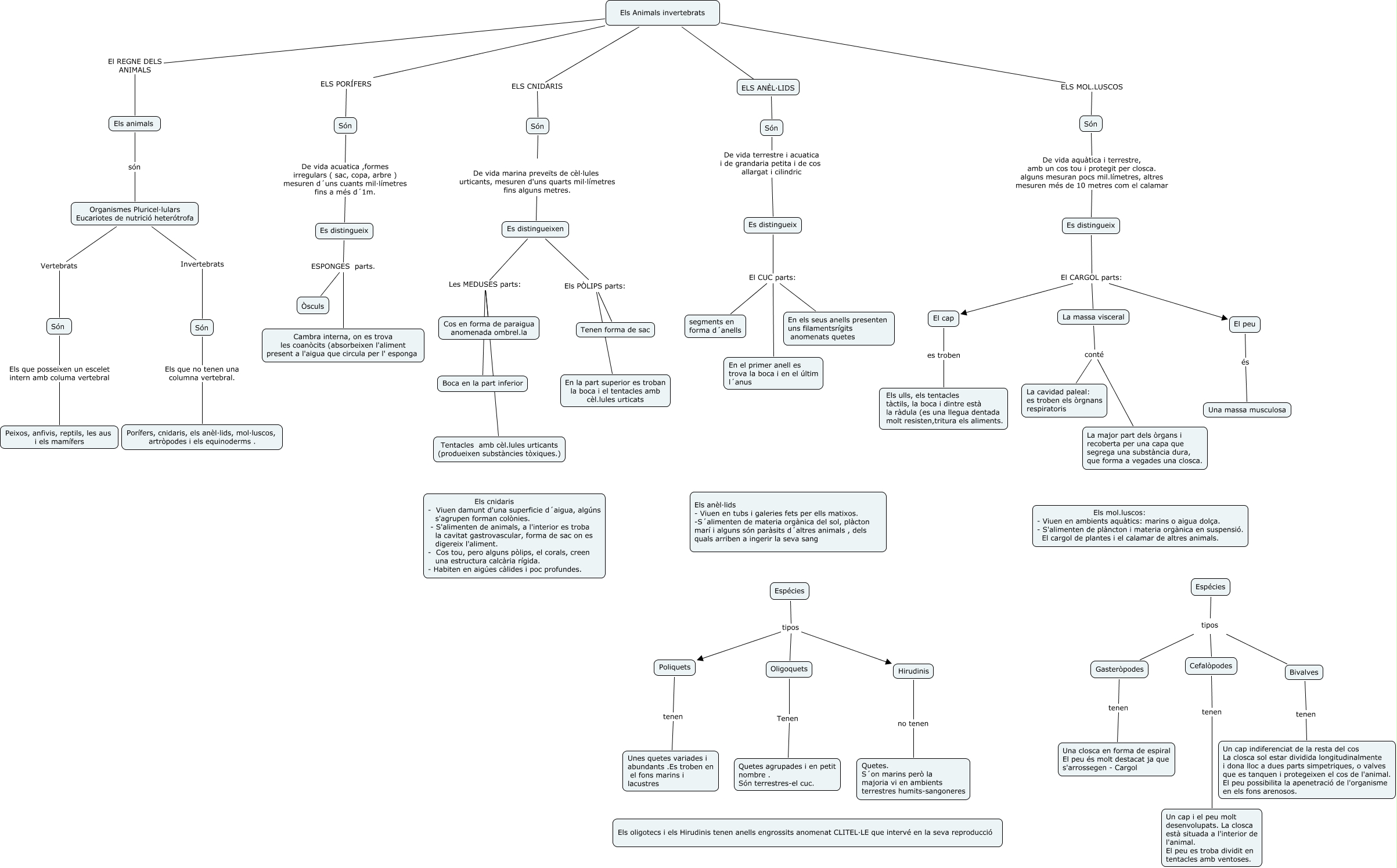 Este Cmap, tiene información relacionada con: invertebrats, Es distingueix ESPONGES parts. Òsculs, Els Animals invertebrats El REGNE DELS ANIMALS Els animals, Es distingueix ESPONGES parts. Cambra interna, on es trova les coanòcits (absorbeixen l'aliment present a l'aigua que circula per l' esponga, Es distingueix El CUC parts: En els seus anells presenten uns filamentsrígits anomenats quetes, Els Animals invertebrats ELS PORÍFERS Són, Es distingueix El CUC parts: En el primer anell es trova la boca i en el últim l´anus, Bivalves tenen Un cap indiferenciat de la resta del cos La closca sol estar dividida longitudinalmente i dona lloc a dues parts simpetriques, o valves que es tanquen i protegeixen el cos de l'animal. El peu possibilita la apenetració de l'organisme en els fons arenosos., El cap es troben Els ulls, els tentacles tàctils, la boca i dintre està la ràdula (es una llegua dentada molt resisten,tritura els aliments., El peu és Una massa musculosa, Organismes Pluricel·lulars Eucariotes de nutrició heterótrofa Invertebrats Són, Es distingueix El CARGOL parts: El peu, Els Animals invertebrats ELS MOL.LUSCOS Són, Es distingueix El CARGOL parts: La massa visceral, Es distingueixen Les MEDUSES parts: Cos en forma de paraigua anomenada ombrel.la, Els animals són Organismes Pluricel·lulars Eucariotes de nutrició heterótrofa, Els Animals invertebrats ???? Són, La massa visceral conté La major part dels òrgans i recoberta per una capa que segrega una substància dura, que forma a vegades una closca., Espécies tipos Cefalòpodes, Oligoquets Tenen Quetes agrupades i en petit nombre . Són terrestres-el cuc., Gasteròpodes tenen Una closca en forma de espiral El peu és molt destacat ja que s'arrossegen - Cargol