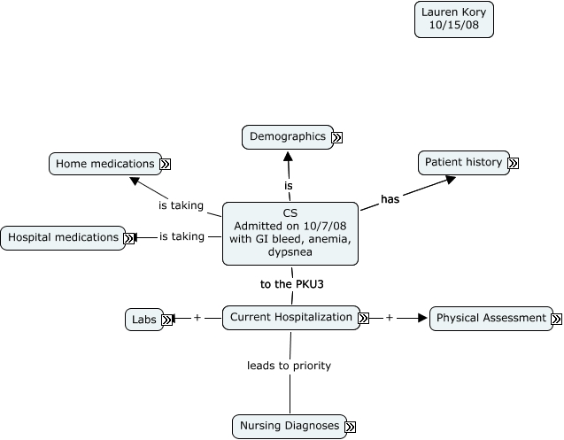 This Concept Map, created with IHMC CmapTools, has information related to: CMAP10-15-08, CS Admitted on 10/7/08 with GI bleed, anemia, dypsnea is taking Home medications, Current Hospitalization + Physical Assessment, CS Admitted on 10/15/08 with GI bleed, anemia, dypsnea has Patient history, CS Admitted on 10/15/08 with GI bleed, anemia, dypsnea is Demographics, CS Admitted on 10/15/08 with GI bleed, anemia, dypsnea is taking Hospital medications, CS Admitted on 10/7/08 with GI bleed, anemia, dypsnea has Patient history, CS Admitted on 10/7/08 with GI bleed, anemia, dypsnea to the PKU3 Current Hospitalization, CS Admitted on 10/7/08 with GI bleed, anemia, dypsnea is Demographics, Current Hospitalization + Labs, CS Admitted on 10/15/08 with GI bleed, anemia, dypsnea to the PKU3 Current Hospitalization, Current Hospitalization leads to priority Nursing Diagnoses