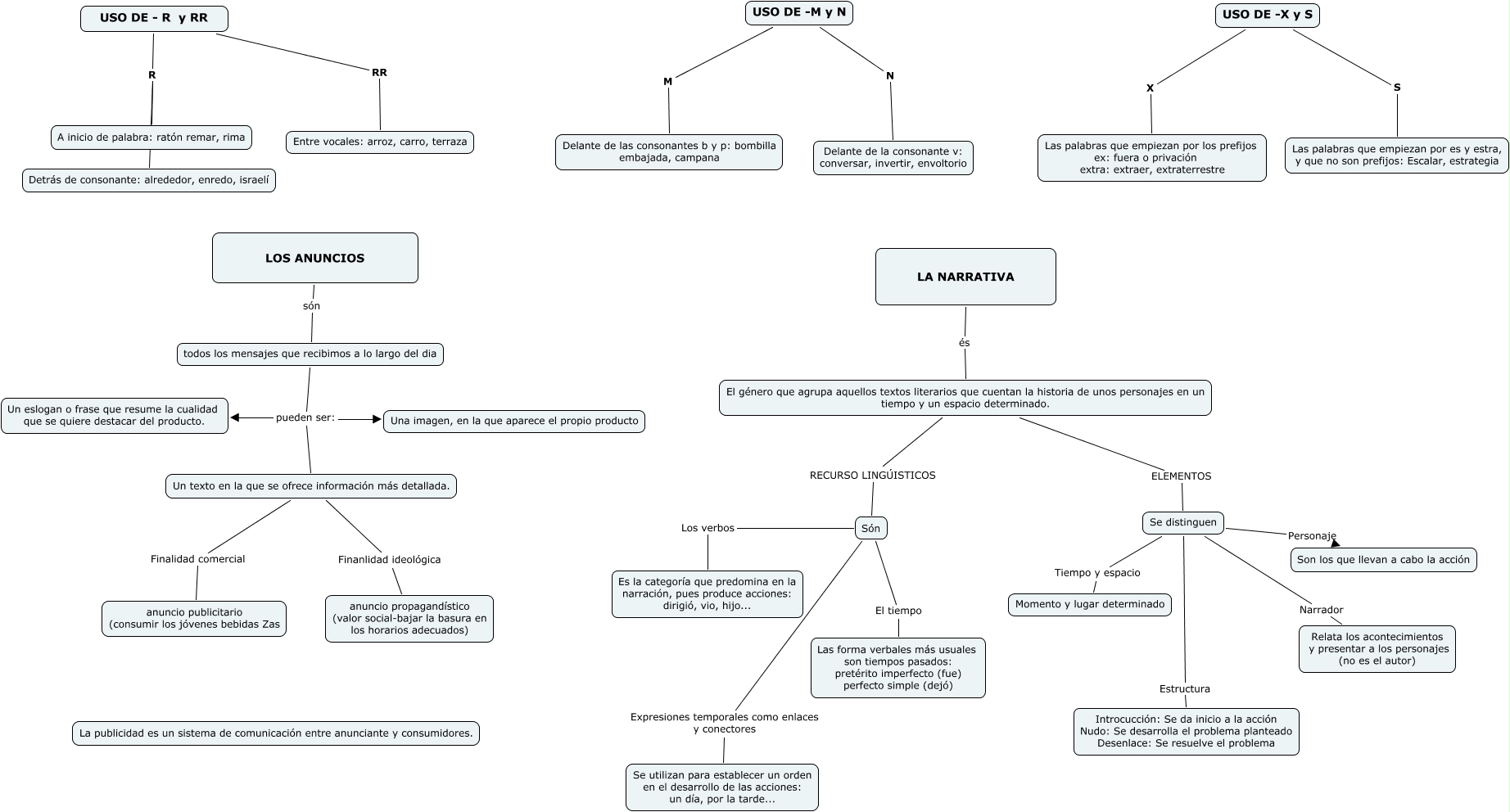 Este Cmap, tiene información relacionada con: cast-tema 8, USO DE -M y N N Delante de la consonante v: conversar, invertir, envoltorio, todos los mensajes que recibimos a lo largo del dia pueden ser: Un texto en la que se ofrece información más detallada., Se distinguen Estructura Introcucción: Se da inicio a la acción Nudo: Se desarrolla el problema planteado Desenlace: Se resuelve el problema, Se distinguen Tiempo y espacio Momento y lugar determinado, LA NARRATIVA és El género que agrupa aquellos textos literarios que cuentan la historia de unos personajes en un tiempo y un espacio determinado., USO DE -X y S S Las palabras que empiezan por es y estra, y que no son prefijos: Escalar, estrategia, Són Los verbos Es la categoría que predomina en la narración, pues produce acciones: dirigió, vio, hijo..., Un texto en la que se ofrece información más detallada. Finalidad comercial anuncio publicitario (consumir los jóvenes bebidas Zas, Se distinguen Narrador Relata los acontecimientos y presentar a los personajes (no es el autor), Se distinguen Personaje Son los que llevan a cabo la acción, LOS ANUNCIOS són todos los mensajes que recibimos a lo largo del dia, Són Expresiones temporales como enlaces y conectores Se utilizan para establecer un orden en el desarrollo de las acciones: un día, por la tarde..., Són El tiempo Las forma verbales más usuales son tiempos pasados: pretérito imperfecto (fue) perfecto simple (dejó), todos los mensajes que recibimos a lo largo del dia pueden ser: Una imagen, en la que aparece el propio producto, USO DE - R y RR R A inicio de palabra: ratón remar, rima, USO DE - R y RR R Detrás de consonante: alrededor, enredo, israelí, USO DE -X y S X Las palabras que empiezan por los prefijos ex: fuera o privación extra: extraer, extraterrestre, USO DE - R y RR RR Entre vocales: arroz, carro, terraza, El género que agrupa aquellos textos literarios que cuentan la historia de unos personajes en un tiempo y un espacio determinado. RECURSO LINGÚISTICOS Són, Un texto en la que se ofrece información más detallada. Finanlidad ideológica anuncio propagandístico (valor social-bajar la basura en los horarios adecuados)
