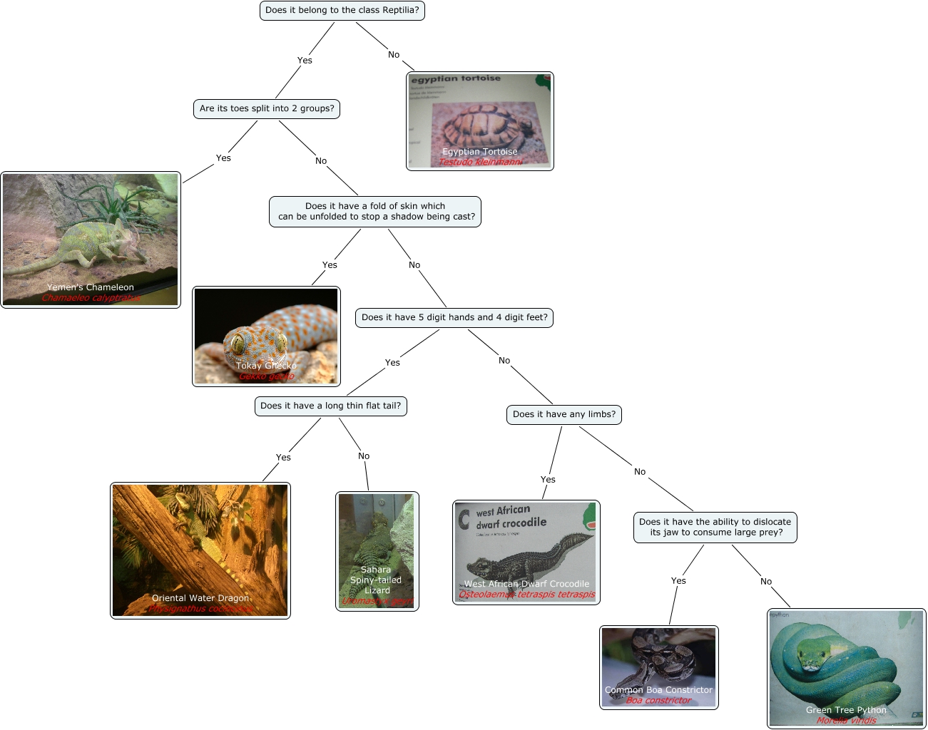 This Concept Map, created with IHMC CmapTools, has information related to: Reptiles, Does it have any limbs? No Does it have the ability to dislocate its jaw to consume large prey?, Does it have 5 digit hands and 4 digit feet? No Does it have any limbs?, Does it have 5 digit hands and 4 digit feet? Yes Does it have a long thin flat tail?, Does it have the ability to dislocate its jaw to consume large prey? Yes Common Boa Constrictor Boa constrictor, Does it have a fold of skin which can be unfolded to stop a shadow being cast? Yes Tokay Ghecko Gekko gecko, Does it have a long thin flat tail? No Sahara Spiny-tailed Lizard Uromastyx geyri, Are its toes split into 2 groups? No Does it have a fold of skin which can be unfolded to stop a shadow being cast?, Does it have the ability to dislocate its jaw to consume large prey? No Green Tree Python Morelia viridis, Does it have any limbs? Yes West African Dwarf Crocodile Osteolaemus tetraspis tetraspis, Does it have a long thin flat tail? Yes Oriental Water Dragon Physignathus cocincinus, Does it have a fold of skin which can be unfolded to stop a shadow being cast? No Does it have 5 digit hands and 4 digit feet?, Does it belong to the class Reptilia? No Egyptian Tortoise Testudo kleinmanni, Does it belong to the class Reptilia? Yes Are its toes split into 2 groups?, Are its toes split into 2 groups? Yes Yemen's Chameleon Chamaeleo calyptratus