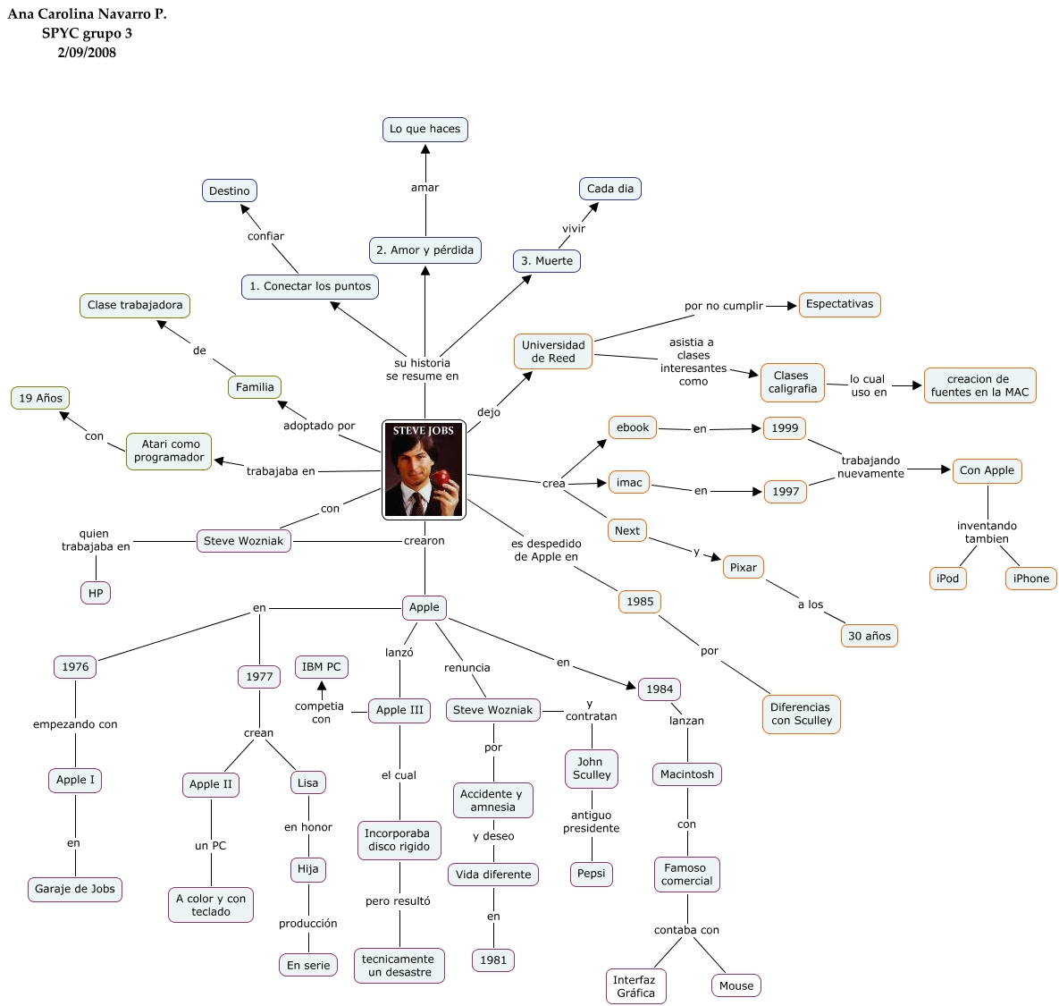 Este Cmap, tiene información relacionada con: Steve Jobs, STEVE JOBS crea ebook, STEVE JOBS crea imac, 1976 empezando con Apple I, Famoso comercial contaba con Mouse, Familia de Clase trabajadora, Apple renuncia Steve Wozniak, Apple III competia con IBM PC, Steve Wozniak por Accidente y amnesia, 1976 en 1977, Steve Wozniak quien trabajaba en HP, Con Apple inventando tambien iPod, STEVE JOBS con Steve Wozniak, Con Apple inventando tambien iPhone, Apple I en Garaje de Jobs, Atari como programador con 19 Años, STEVE JOBS dejo Universidad de Reed, Steve Wozniak y contratan John Sculley, 1984 lanzan Macintosh, STEVE JOBS adoptado por Familia, John Sculley antiguo presidente Pepsi