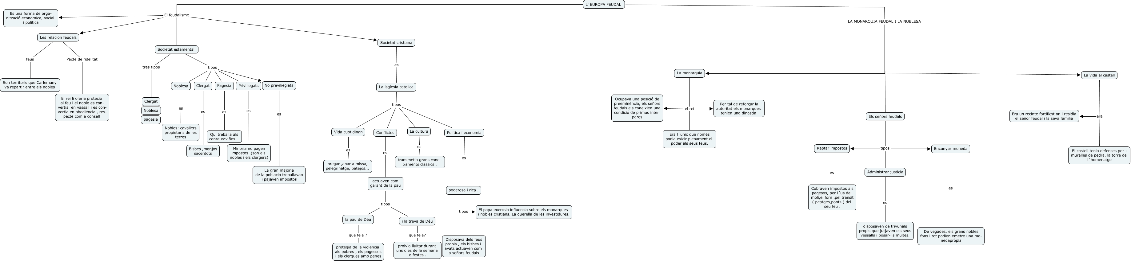 Este Cmap, tiene información relacionada con: EL FEUDALISMO, Clergat es Bisbes ,monjos sacerdots, Conflictes es actuaven com garant de la pau, Administrar justicia es disposaven de trivunals propis que jutjaven els seus vessalls i posar-lis multes., No previliegiats es La gran majoria de la població treballavan i pajaven impostos, La isglesia catolica tipos La cultura, La monarquia el rei Ocupava una posició de preeminència, els señors feudals els coneixien una condició de primus inter pares, poderosa i rica . tipos Disposava dels feus propis , els bisbes i avats actuaven com a señors feudals, la pau de Déu que feia ? protegia de la violencia als pobres , els pagessos i els clergues amb penes, La isglesia catolica tipos Vida cuotidinan, L´EUROPA FEUDAL El feudalisme Societat estamental, Els señors feudals tipos Administrar justicia, Societat estamental tipos Pagesia, La isglesia catolica tipos Conflictes, Societat estamental tipos Noblesa, Societat estamental tres tipos pagesia, La vida al castell era Era un recinte fortificst on i residia el señor feudal i la seva familia, L´EUROPA FEUDAL LA MONARQUIA FEUDAL I LA NOBLESA Els señors feudals, La monarquia el rei Per tal de reforçar la autoritat els monarques tenien una dinastia, Pagesia es Qui treballa als conreus:viñes..., Priviliegats es Minoria no pagen impostos .(son els nobles i els clergers)