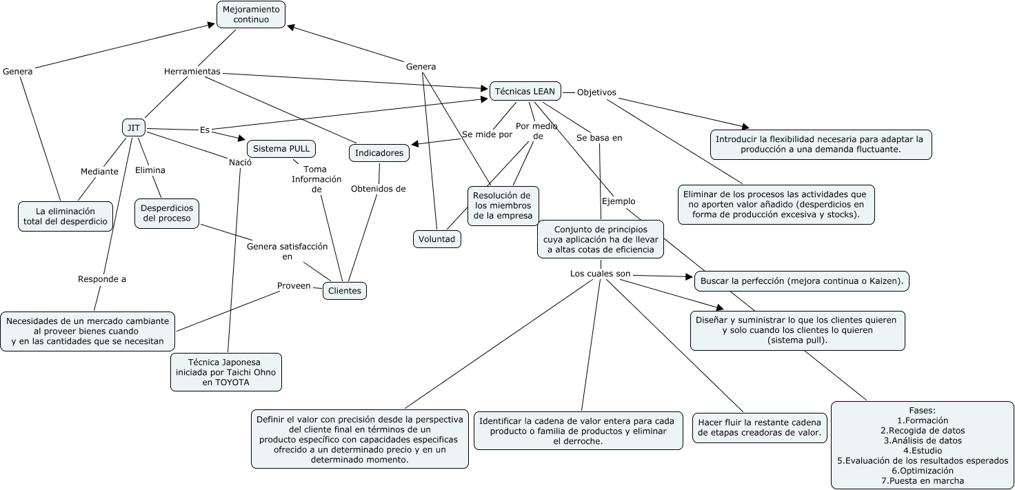 Este Cmap, tiene información relacionada con: Tres Artículos Santiago Giraldo, Conjunto de principios cuya aplicación ha de llevar a altas cotas de eficiencia Los cuales son Diseñar y suministrar lo que los clientes quieren y solo cuando los clientes lo quieren (sistema pull)., Mejoramiento continuo Herramientas JIT, Técnicas LEAN Objetivos Eliminar de los procesos las actividades que no aporten valor añadido (desperdicios en forma de producción excesiva y stocks)., JIT Responde a Necesidades de un mercado cambiante al proveer bienes cuando y en las cantidades que se necesitan, Resolución de los miembros de la empresa Genera Mejoramiento continuo, Conjunto de principios cuya aplicación ha de llevar a altas cotas de eficiencia Los cuales son Identificar la cadena de valor entera para cada producto o familia de productos y eliminar el derroche., Técnicas LEAN Por medio de Voluntad, Conjunto de principios cuya aplicación ha de llevar a altas cotas de eficiencia Los cuales son Hacer fluir la restante cadena de etapas creadoras de valor., JIT Nació Técnica Japonesa iniciada por Taichi Ohno en TOYOTA, Técnicas LEAN Se mide por Indicadores, Técnicas LEAN Por medio de Resolución de los miembros de la empresa, Mejoramiento continuo Herramientas Indicadores, Clientes Proveen Necesidades de un mercado cambiante al proveer bienes cuando y en las cantidades que se necesitan, JIT Es Técnicas LEAN, Técnicas LEAN Ejemplo Fases: 1.Formación 2.Recogida de datos 3.Análisis de datos 4.Estudio 5.Evaluación de los resultados esperados 6.Optimización 7.Puesta en marcha, JIT Elimina Desperdicios del proceso, Indicadores Obtenidos de Clientes, Conjunto de principios cuya aplicación ha de llevar a altas cotas de eficiencia Los cuales son Definir el valor con precisión desde la perspectiva del cliente final en términos de un producto específico con capacidades especificas ofrecido a un determinado precio y en un determinado momento., Conjunto de principios cuya aplicación ha de llevar a altas cotas de eficiencia Los cuales son Buscar la perfección (mejora continua o Kaizen)., Sistema PULL Toma Información de Clientes