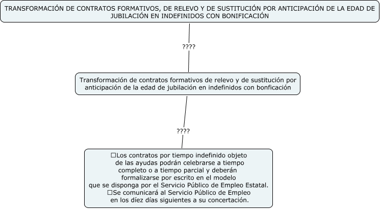Este Cmap, tiene información relacionada con: TRANSFORMACIÓN DE CONTRATOS FORMATIVOS, DE RELEVO Y DE SUSTITUCIÓN POR ANTICIPACIÓN DE LA EDAD DE JUBILACIÓN EN INDEFINIDOS CON BONIFICACIÓN, Transformación de contratos formativos de relevo y de sustitución por anticipación de la edad de jubilación en indefinidos con bonficación ???? Los contratos por tiempo indefinido objeto de las ayudas podrán celebrarse a tiempo completo o a tiempo parcial y deberán formalizarse por escrito en el modelo que se disponga por el Servicio Público de Empleo Estatal. Se comunicará al Servicio Público de Empleo en los díez días siguientes a su concertación., TRANSFORMACIÓN DE CONTRATOS FORMATIVOS, DE RELEVO Y DE SUSTITUCIÓN POR ANTICIPACIÓN DE LA EDAD DE JUBILACIÓN EN INDEFINIDOS CON BONIFICACIÓN ???? Transformación de contratos formativos de relevo y de sustitución por anticipación de la edad de jubilación en indefinidos con bonficación