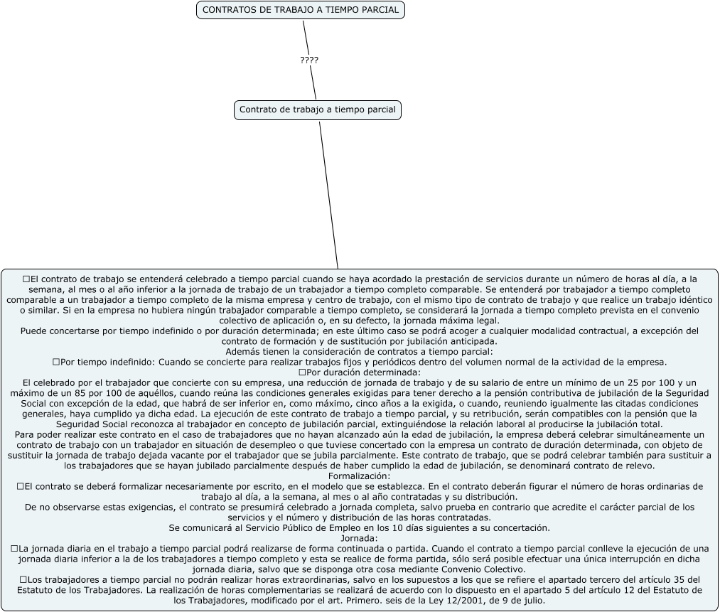 Este Cmap, tiene información relacionada con: CONTRATOS A TIEMPO PARCIAL, CONTRATOS DE TRABAJO A TIEMPO PARCIAL ???? Contrato de trabajo a tiempo parcial, Contrato de trabajo a tiempo parcial ???? El contrato de trabajo se entenderá celebrado a tiempo parcial cuando se haya acordado la prestación de servicios durante un número de horas al día, a la semana, al mes o al año inferior a la jornada de trabajo de un trabajador a tiempo completo comparable. Se entenderá por trabajador a tiempo completo comparable a un trabajador a tiempo completo de la misma empresa y centro de trabajo, con el mismo tipo de contrato de trabajo y que realice un trabajo idéntico o similar. Si en la empresa no hubiera ningún trabajador comparable a tiempo completo, se considerará la jornada a tiempo completo prevista en el convenio colectivo de aplicación o, en su defecto, la jornada máxima legal. Puede concertarse por tiempo indefinido o por duración determinada; en este último caso se podrá acoger a cualquier modalidad contractual, a excepción del contrato de formación y de sustitución por jubilación anticipada. Además tienen la consideración de contratos a tiempo parcial: Por tiempo indefinido: Cuando se concierte para realizar trabajos fijos y periódicos dentro del volumen normal de la actividad de la empresa. Por duración determinada: El celebrado por el trabajador que concierte con su empresa, una reducción de jornada de trabajo y de su salario de entre un mínimo de un 25 por 100 y un máximo de un 85 por 100 de aquéllos, cuando reúna las condiciones generales exigidas para tener derecho a la pensión contributiva de jubilación de la Seguridad Social con excepción de la edad, que habrá de ser inferior en, como máximo, cinco años a la exigida, o cuando, reuniendo igualmente las citadas condiciones generales, haya cumplido ya dicha edad. La ejecución de este contrato de trabajo a tiempo parcial, y su retribución, serán compatibles con la pensión que la Seguridad Social reconozca al trabajador en concepto de jubilación parcial, extinguiéndose la relación laboral al producirse la jubilación total. Para poder realizar este contrato en el caso de trabajadores que no hayan alcanzado aún la edad de jubilación, la empresa deberá celebrar simultáneamente un contrato de trabajo con un trabajador en situación de desempleo o que tuviese concertado con la empresa un contrato de duración determinada, con objeto de sustituir la jornada de trabajo dejada vacante por el trabajador que se jubila parcialmente. Este contrato de trabajo, que se podrá celebrar también para sustituir a los trabajadores que se hayan jubilado parcialmente después de haber cumplido la edad de jubilación, se denominará contrato de relevo. Formalización: El contrato se deberá formalizar necesariamente por escrito, en el modelo que se establezca. En el contrato deberán figurar el número de horas ordinarias de trabajo al día, a la semana, al mes o al año contratadas y su distribución. De no observarse estas exigencias, el contrato se presumirá celebrado a jornada completa, salvo prueba en contrario que acredite el carácter parcial de los servicios y el número y distribución de las horas contratadas. Se comunicará al Servicio Público de Empleo en los 10 días siguientes a su concertación. Jornada: La jornada diaria en el trabajo a tiempo parcial podrá realizarse de forma continuada o partida. Cuando el contrato a tiempo parcial conlleve la ejecución de una jornada diaria inferior a la de los trabajadores a tiempo completo y esta se realice de forma partida, sólo será posible efectuar una única interrupción en dicha jornada diaria, salvo que se disponga otra cosa mediante Convenio Colectivo. Los trabajadores a tiempo parcial no podrán realizar horas extraordinarias, salvo en los supuestos a los que se refiere el apartado tercero del artículo 35 del Estatuto de los Trabajadores. La realización de horas complementarias se realizará de acuerdo con lo dispuesto en el apartado 5 del artículo 12 del Estatuto de los Trabajadores, modificado por el art. Primero. seis de la Ley 12/2001, de 9 de julio.