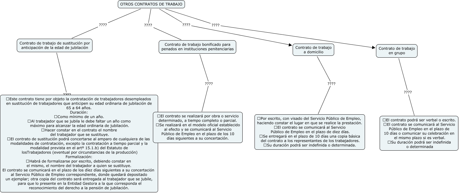 Este Cmap, tiene información relacionada con: OTROS CONTRATOS DE TRABAJO, OTROS CONTRATOS DE TRABAJO ???? Contrato de trabajo de sustitución por anticipación de la edad de jubilación, OTROS CONTRATOS DE TRABAJO ???? Contrato de trabajo en grupo, Contrato de trabajo en grupo ???? El contrato podrá ser verbal o escrito. El contrato se comunicará al Servicio Público de Empleo en el plazo de 10 días o comunicar su celebración en el mismo plazo si es verbal. Su duración podrá ser indefinida o determinada, OTROS CONTRATOS DE TRABAJO ???? Contrato de trabajo a domicilio, Contrato de trabajo de sustitución por anticipación de la edad de jubilación ???? Este contrato tiene por objeto la contratación de trabajadores desempleados en sustitución de trabajadores que anticipen su edad ordinaria de jubilación de 65 a 64 años. Duración: Como mínimo de un año. Al trabajador que se jubila le debe faltar un año como máximo para alcanzar la edad ordinaria de jubilación. Hacer constar en el contrato el nombre del trabajador que se sustituye. El contrato de sustitución podrá concertarse al amparo de cualquiera de las modalidades de contratación, excepto la contratación a tiempo parcial y la modalidad prevista en el artº 15.1.b) del Estatuto de losTrabajadores (eventual por circunstancias de la producción) Formalización: Habrá de formalizarse por escrito, debiendo constar en el mismo, el nombre del trabajador a quien se sustituye. El contrato se comunicará en el plazo de los díez días siguientes a su concertación al Servicio Público de Empleo correspondiente, donde quedará depositado un ejemplar; otra copia del contrato será entregada al trabajador que se jubile, para que lo presente en la Entidad Gestora a la que corresponda el reconocimiento del derecho a la pensión de jubilación., OTROS CONTRATOS DE TRABAJO ???? Contrato de trabajo bonificado para penados en instituciones penitenciarias, Contrato de trabajo a domicilio ???? Por escrito, con visado del Servicio Público de Empleo, haciendo constar el lugar en que se realice la prestación. El contrato se comunicará al Servicio Público de Empleo en el plazo de diez días. Se entregará en el plazo de 10 días una copia básica del contrato a los representantes de los trabajadores. Su duración podrá ser indefinida o determinada., Contrato de trabajo bonificado para penados en instituciones penitenciarias ???? El contrato se realizará por obra o servicio determinado, a tiempo completo o parcial. Se realizará en el modelo oficial establecido al efecto y se comunicará al Servicio Público de Empleo en el plazo de los 10 días siguientes a su concertación.