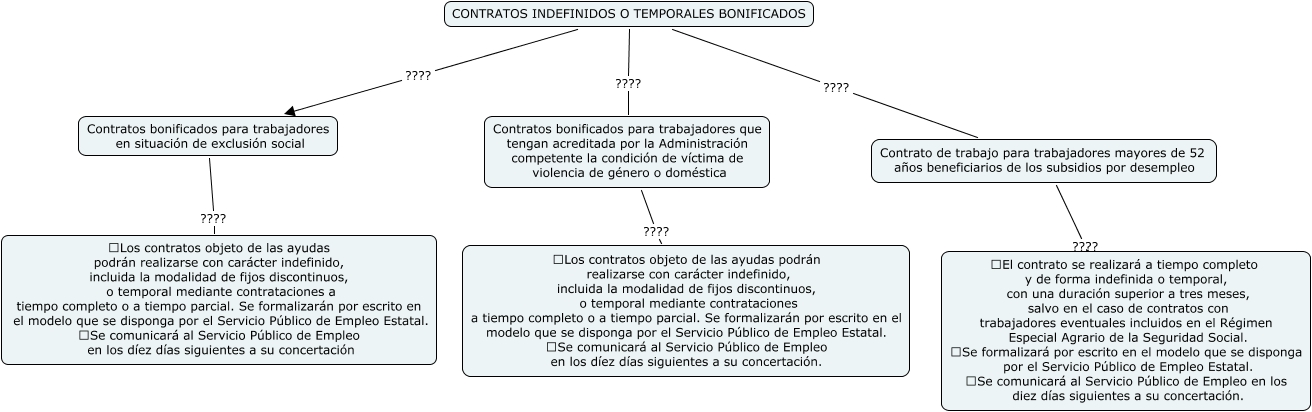 Este Cmap, tiene información relacionada con: CONTRATOS INDEFINIDOS O TEMPORALES BONIFICADOS, Contratos bonificados para trabajadores que tengan acreditada por la Administración competente la condición de víctima de violencia de género o doméstica ???? Los contratos objeto de las ayudas podrán realizarse con carácter indefinido, incluida la modalidad de fijos discontinuos, o temporal mediante contrataciones a tiempo completo o a tiempo parcial. Se formalizarán por escrito en el modelo que se disponga por el Servicio Público de Empleo Estatal. Se comunicará al Servicio Público de Empleo en los díez días siguientes a su concertación., CONTRATOS INDEFINIDOS O TEMPORALES BONIFICADOS ???? Contratos bonificados para trabajadores en situación de exclusión social, CONTRATOS INDEFINIDOS O TEMPORALES BONIFICADOS ???? Contratos bonificados para trabajadores que tengan acreditada por la Administración competente la condición de víctima de violencia de género o doméstica, CONTRATOS INDEFINIDOS O TEMPORALES BONIFICADOS ???? Contrato de trabajo para trabajadores mayores de 52 años beneficiarios de los subsidios por desempleo, Contrato de trabajo para trabajadores mayores de 52 años beneficiarios de los subsidios por desempleo ???? El contrato se realizará a tiempo completo y de forma indefinida o temporal, con una duración superior a tres meses, salvo en el caso de contratos con trabajadores eventuales incluidos en el Régimen Especial Agrario de la Seguridad Social. Se formalizará por escrito en el modelo que se disponga por el Servicio Público de Empleo Estatal. Se comunicará al Servicio Público de Empleo en los diez días siguientes a su concertación., Contratos bonificados para trabajadores en situación de exclusión social ???? Los contratos objeto de las ayudas podrán realizarse con carácter indefinido, incluida la modalidad de fijos discontinuos, o temporal mediante contrataciones a tiempo completo o a tiempo parcial. Se formalizarán por escrito en el modelo que se disponga por el Servicio Público de Empleo Estatal. Se comunicará al Servicio Público de Empleo en los díez días siguientes a su concertación