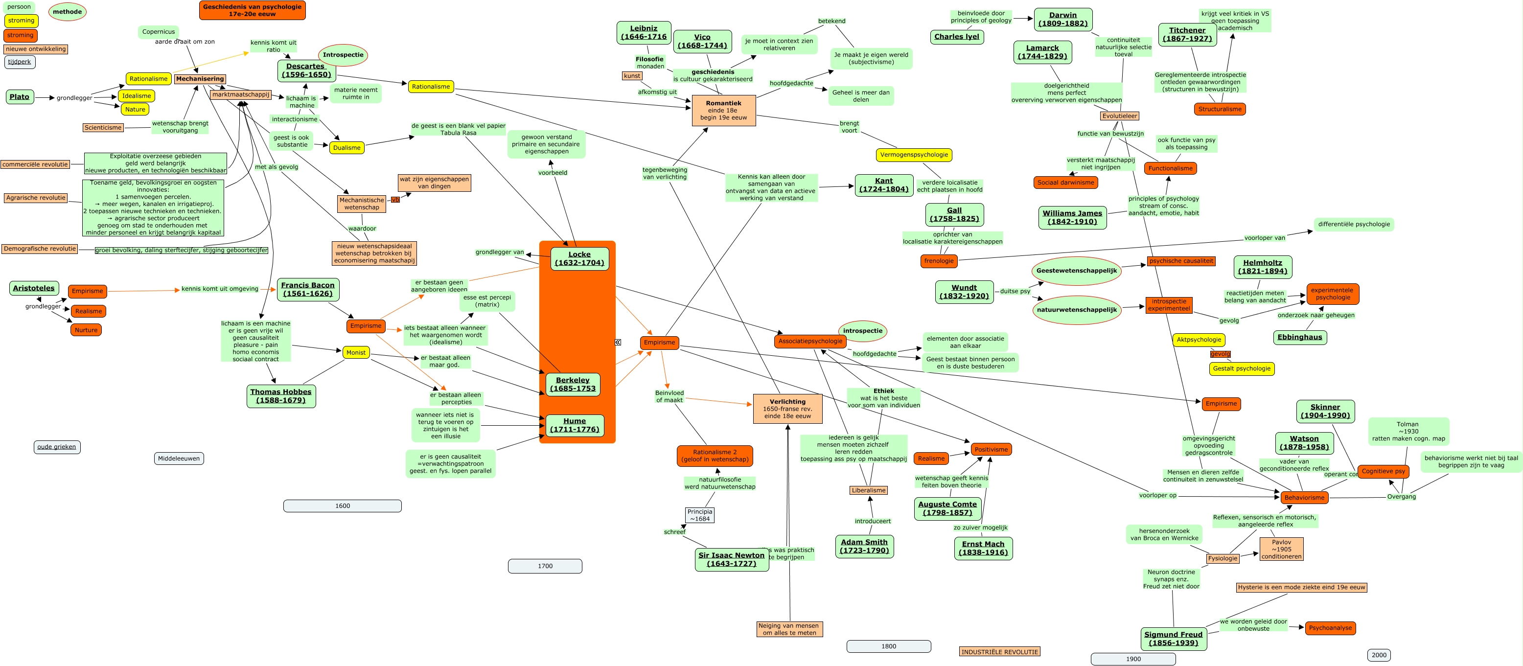 Deze Concept Map heeft informatie gerelateerd aan: geschiedenis van de psychologie, invloeden en stromingen, frenologie voorloper van differentiële psychologie, Darwin (1809-1882) continuiteit natuurlijke selectie toeval Evolutieleer, Associatiepsychologie voorloper op Behaviorisme, Mechanisering lichaam is een machine er is geen vrije wil geen causaliteit pleasure - pain homo economis sociaal contract Monist, Empirisme Positivisme, Liberalisme Ethiek wat is het beste voor som van individuen Associatiepsychologie, je moet in context zien relativeren betekend Je maakt je eigen wereld (subjectivisme), Monist er bestaan alleen percepties Hume (1711-1776), Mechanisering marktmaatschappij, Mechanisering lichaam is machine materie neemt ruimte in, Skinner (1904-1990) operant conditioneren Behaviorisme, Mechanistische wetenschap waardoor nieuw wetenschapsideaal wetenschap betrokken bij economisering maatschapij, Monist er bestaat alleen maar god. Berkeley (1685-1753, Adam Smith (1723-1790) introduceert Liberalisme, Verlichting 1650-franse rev. einde 18e eeuw tegenbeweging van verlichting Romantiek einde 18e begin 19e eeuw, Associatiepsychologie iedereen is gelijk mensen moeten zichzelf leren redden toepassing ass psy op maatschappij Liberalisme, Fysiologie Pavlov ~1905 conditioneren, Structuralisme krijgt veel kritiek in VS geen toepassing academisch, Empirisme er bestaan geen aangeboren ideeen Locke (1632-1704), Evolutieleer Mensen en dieren zelfde continuiteit in zenuwstelsel Behaviorisme