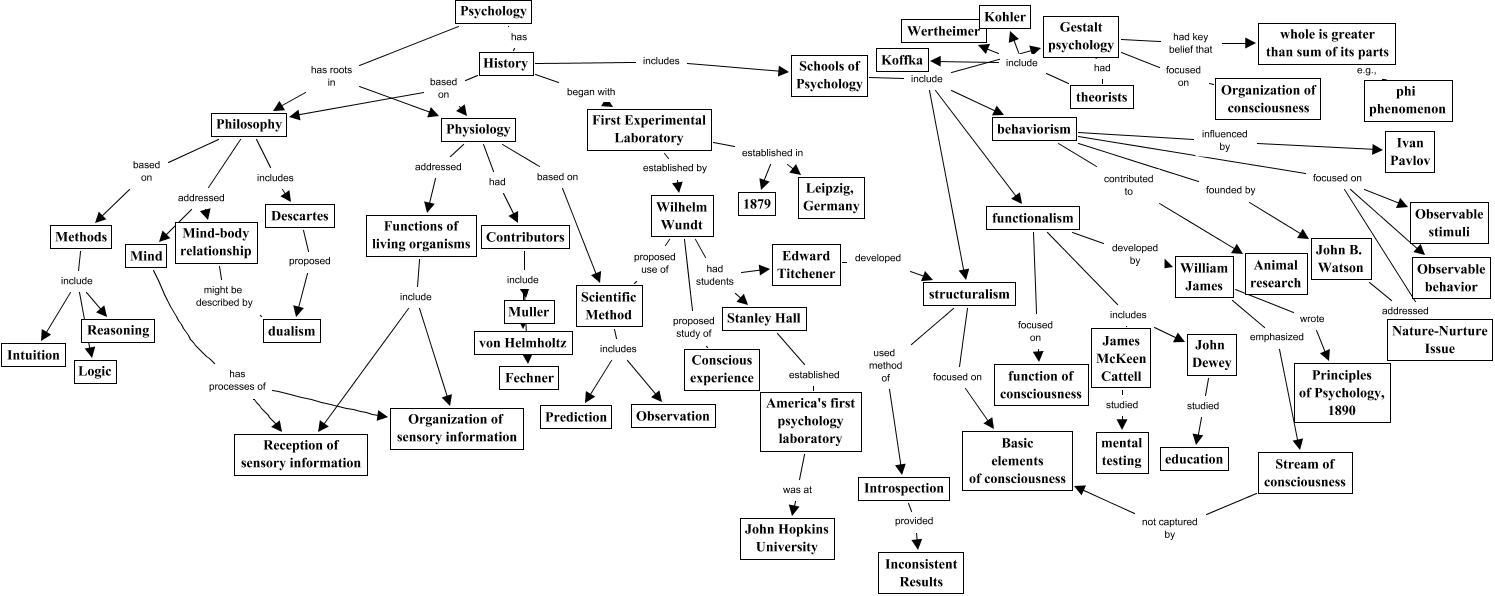 Deze Concept Map heeft informatie gerelateerd aan: Evolution of Psychology, Mind has processes of Organization of sensory information, America's first psychology laboratory was at John Hopkins University, Stream of consciousness not captured by Basic elements of consciousness, Philosophy includes Descartes, Schools of Psychology include behaviorism, Physiology had Contributors, Stanley Hall established America's first psychology laboratory, Wilhelm Wundt had students Edward Titchener, Psychology has roots in Physiology, whole is greater than sum of its parts e.g., phi phenomenon, Methods include Reasoning, Contributors include Muller, Nature-Nurture Issue focused on Observable stimuli, Schools of Psychology include structuralism, behaviorism influenced by Ivan Pavlov, Physiology based on Scientific Method, Descartes proposed dualism, functionalism focused on function of consciousness, James McKeen Cattell studied mental testing, Gestalt psychology had key belief that whole is greater than sum of its parts