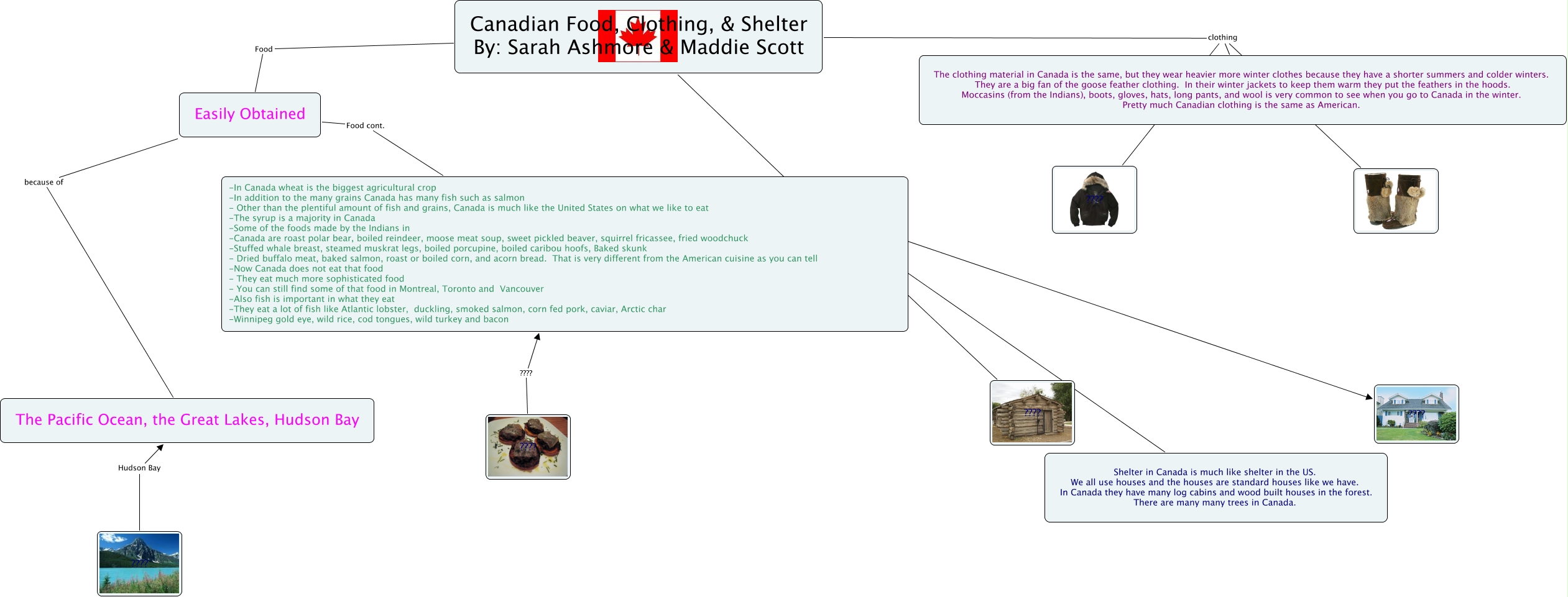This Concept Map, created with IHMC CmapTools, has information related to: canada food shelter clothing, Easily Obtained Food cont. -In Canada wheat is the biggest agricultural crop -In addition to the many grains Canada has many fish such as salmon - Other than the plentiful amount of fish and grains, Canada is much like the United States on what we like to eat -The syrup is a majority in Canada -Some of the foods made by the Indians in -Canada are roast polar bear, boiled reindeer, moose meat soup, sweet pickled beaver, squirrel fricassee, fried woodchuck -Stuffed whale breast, steamed muskrat legs, boiled porcupine, boiled caribou hoofs, Baked skunk - Dried buffalo meat, baked salmon, roast or boiled corn, and acorn bread. That is very different from the American cuisine as you can tell -Now Canada does not eat that food - They eat much more sophisticated food - You can still find some of that food in Montreal, Toronto and Vancouver -Also fish is important in what they eat -They eat a lot of fish like Atlantic lobster, duckling, smoked salmon, corn fed pork, caviar, Arctic char -Winnipeg gold eye, wild rice, cod tongues, wild turkey and bacon, Canadian Food, Clothing, & Shelter By: Sarah Ashmore & Maddie Scott clothing The clothing material in Canada is the same, but they wear heavier more winter clothes because they have a shorter summers and colder winters. They are a big fan of the goose feather clothing. In their winter jackets to keep them warm they put the feathers in the hoods. Moccasins (from the Indians), boots, gloves, hats, long pants, and wool is very common to see when you go to Canada in the winter. Pretty much Canadian clothing is the same as American., Canadian Food, Clothing, & Shelter By: Sarah Ashmore & Maddie Scott clothing ????, Canadian Food, Clothing, & Shelter By: Sarah Ashmore & Maddie Scott Shelter ????, ???? ???? -In Canada wheat is the biggest agricultural crop -In addition to the many grains Canada has many fish such as salmon - Other than the plentiful amount of fish and grains, Canada is much like the United States on what we like to eat -The syrup is a majority in Canada -Some of the foods made by the Indians in -Canada are roast polar bear, boiled reindeer, moose meat soup, sweet pickled beaver, squirrel fricassee, fried woodchuck -Stuffed whale breast, steamed muskrat legs, boiled porcupine, boiled caribou hoofs, Baked skunk - Dried buffalo meat, baked salmon, roast or boiled corn, and acorn bread. That is very different from the American cuisine as you can tell -Now Canada does not eat that food - They eat much more sophisticated food - You can still find some of that food in Montreal, Toronto and Vancouver -Also fish is important in what they eat -They eat a lot of fish like Atlantic lobster, duckling, smoked salmon, corn fed pork, caviar, Arctic char -Winnipeg gold eye, wild rice, cod tongues, wild turkey and bacon, Canadian Food, Clothing, & Shelter By: Sarah Ashmore & Maddie Scott Shelter ????, Canadian Food, Clothing, & Shelter By: Sarah Ashmore & Maddie Scott clothing, Canadian Food, Clothing, & Shelter By: Sarah Ashmore & Maddie Scott Shelter Shelter in Canada is much like shelter in the US. We all use houses and the houses are standard houses like we have. In Canada they have many log cabins and wood built houses in the forest. There are many many trees in Canada., Easily Obtained because of The Pacific Ocean, the Great Lakes, Hudson Bay, ???? Hudson Bay The Pacific Ocean, the Great Lakes, Hudson Bay, Canadian Food, Clothing, & Shelter By: Sarah Ashmore & Maddie Scott Food Easily Obtained