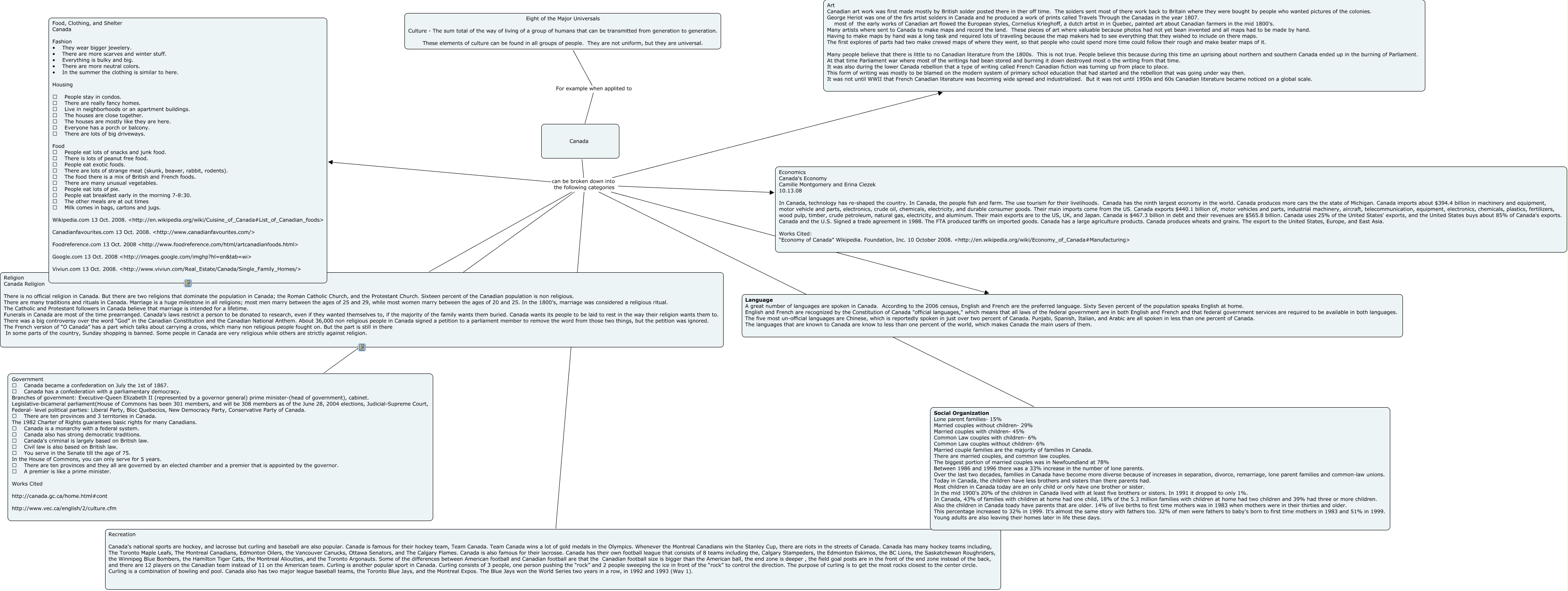 Dieses mit IHMC CmapTools erstellte CMap hat Informationen bezüglich: Cultural Universals(1), Eight of the Major Universals Culture - The sum total of the way of living of a group of humans that can be transmitted from generation to generation. These elements of culture can be found in all groups of people. They are not uniform, but they are universal. For example when applited to Canada, Canada can be broken down into the following categories Language A great number of languages are spoken in Canada. According to the 2006 census, English and French are the preferred language. Sixty Seven percent of the population speaks English at home. English and French are recognized by the Constitution of Canada "official languages," which means that all laws of the federal government are in both English and French and that federal government services are required to be available in both languages. The five most un-official languages are Chinese, which is reportedly spoken in just over two percent of Canada. Punjabi, Spanish, Italian, and Arabic are all spoken in less than one percent of Canada. The languages that are known to Canada are know to less than one percent of the world, which makes Canada the main users of them., Canada can be broken down into the following categories Social Organization Lone parent families- 15% Married couples without children- 29% Married couples with children- 45% Common Law couples with children- 6% Common Law couples without children- 6% Married couple families are the majority of families in Canada. There are married couples, and common law couples. The biggest portion of married couples was in Newfoundland at 78% Between 1986 and 1996 there was a 33% increase in the number of lone parents. Over the last two decades, families in Canada have become more diverse because of increases in separation, divorce, remarriage, lone parent families and common-law unions. Today in Canada, the children have less brothers and sisters than there parents had. Most children in Canada today are an only child or only have one brother or sister. In the mid 1900's 20% of the children in Canada lived with at least five brothers or sisters. In 1991 it dropped to only 1%. In Canada, 43% of families with children at home had one child, 18% of the 5.3 million families with children at home had two children and 39% had three or more children. Also the children in Canada toady have parents that are older. 14% of live births to first time mothers was in 1983 when mothers were in their thirties and older. This percentage increased to 32% in 1999. It's almost the same story with fathers too. 32% of men were fathers to baby's born to first time mothers in 1983 and 51% in 1999. Young adults are also leaving their homes later in life these days., Canada can be broken down into the following categories Food, Clothing, and Shelter Canada Fashion • They wear bigger jewelery. • There are more scarves and winter stuff. • Everything is bulky and big. • There are more neutral colors. • In the summer the clothing is similar to here. Housing People stay in condos. There are really fancy homes. Live in neighborhoods or an apartment buildings. The houses are close together. The houses are mostly like they are here. Everyone has a porch or balcony. There are lots of big driveways. Food People eat lots of snacks and junk food. There is lots of peanut free food. People eat exotic foods. There are lots of strange meat (skunk, beaver, rabbit, rodents). The food there is a mix of British and French foods. There are many unusual vegetables. People eat lots of pie. People eat breakfast early in the morning 7-8:30. The other meals are at out times Milk comes in bags, cartons and jugs. Wikipedia.com 13 Oct. 2008. <http://en.wikipedia.org/wiki/Cuisine_of_Canada#List_of_Canadian_foods> Canadianfavourites.com 13 Oct. 2008. <http://www.canadianfavourites.com/> Foodreference.com 13 Oct. 2008 <http://www.foodreference.com/html/artcanadianfoods.html> Google.com 13 Oct. 2008 <http://images.google.com/imghp?hl=en&tab=wi> Viviun.com 13 Oct. 2008. <http://www.viviun.com/Real_Estate/Canada/Single_Family_Homes/>, Canada can be broken down into the following categories Recreation Canada's national sports are hockey, and lacrosse but curling and baseball are also popular. Canada is famous for their hockey team, Team Canada. Team Canada wins a lot of gold medals in the Olympics. Whenever the Montreal Canadians win the Stanley Cup, there are riots in the streets of Canada. Canada has many hockey teams including, The Toronto Maple Leafs, The Montreal Canadians, Edmonton Oilers, the Vancouver Canucks, Ottawa Senators, and The Calgary Flames. Canada is also famous for their lacrosse. Canada has their own football league that consists of 8 teams including the, Calgary Stampeders, the Edmonton Eskimos, the BC Lions, the Saskatchewan Roughriders, the Winnipeg Blue Bombers, the Hamilton Tiger Cats, the Montreal Aliouttes, and the Toronto Argonauts. Some of the differences between American football and Canadian football are that the Canadian football size is bigger than the American ball, the end zone is deeper , the field goal posts are in the front of the end zone instead of the back, and there are 12 players on the Canadian team instead of 11 on the American team. Curling is another popular sport in Canada. Curling consists of 3 people, one person pushing the “rock” and 2 people sweeping the ice in front of the “rock” to control the direction. The purpose of curling is to get the most rocks closest to the center circle. Curling is a combination of bowling and pool. Canada also has two major league baseball teams, the Toronto Blue Jays, and the Montreal Expos. The Blue Jays won the World Series two years in a row, in 1992 and 1993 (Way 1)., Canada can be broken down into the following categories Religion Canada Religion There is no official religion in Canada. But there are two religions that dominate the population in Cana