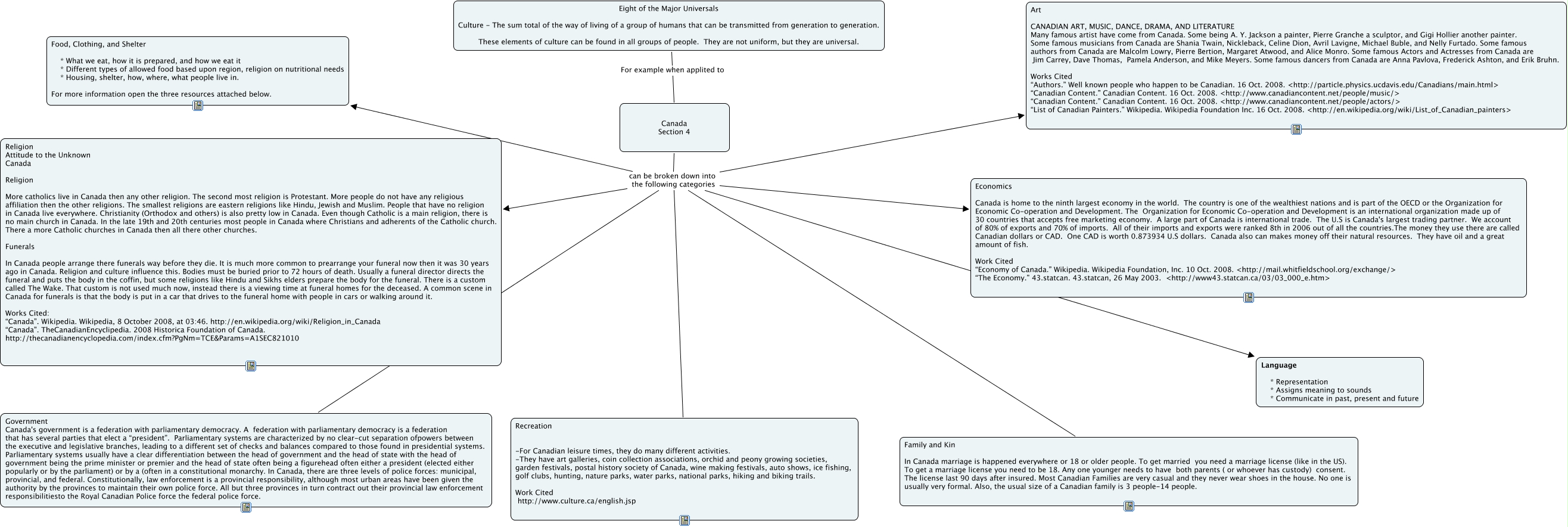 This Concept Map, created with IHMC CmapTools, has information related to: Cultural Universals(4), Eight of the Major Universals Culture - The sum total of the way of living of a group of humans that can be transmitted from generation to generation. These elements of culture can be found in all groups of people. They are not uniform, but they are universal. For example when applited to Canada Section 4, Canada Section 4 can be broken down into the following categories Language * Representation * Assigns meaning to sounds * Communicate in past, present and future, Canada Section 4 can be broken down into the following categories Family and Kin In Canada marriage is happened everywhere or 18 or older people. To get married you need a marriage license (like in the US). To get a marriage license you need to be 18. Any one younger needs to have both parents ( or whoever has custody) consent. The license last 90 days after insured. Most Canadian Families are very casual and they never wear shoes in the house. No one is usually very formal. Also, the usual size of a Canadian family is 3 people-14 people., Canada Section 4 can be broken down into the following categories Food, Clothing, and Shelter * What we eat, how it is prepared, and how we eat it * Different types of allowed food based upon region, religion on nutritional needs * Housing, shelter, how, where, what people live in. For more information open the three resources attached below., Canada Section 4 can be broken down into the following categories Recreation -For Canadian leisure times, they do many different activities. -They have art galleries, coin collection associations, orchid and peony growing societies, garden festivals, postal history society of Canada, wine making festivals, auto shows, ice fishing, golf clubs, hunting, nature parks, water parks, national parks, hiking and biking trails. Work Cited http://www.culture.ca/english.jsp, Canada Section 4 can be broken down into the following categories Religion Attitude to the Unknown Canada Religion More catholics live in Canada then any other religion. The second most religion is Protestant. More people do not have any religious affiliation then the other religions. The smallest religions are eastern religions like Hindu, Jewish and Muslim. People that have no religion in Canada live everywhere. Christianity (Orthodox and others) is also pretty low in Canada. Even though Catholic is a main religion, there is no main church in Canada. In the late 19th and 20th centuries most people in Canada where Christians and adherents of the Catholic church. There a more Catholic churches in Canada then all there other churches. Funerals In Canada people arrange there funerals way before they die. It is much more common to prearrange your funeral now then it was 30 years ago in Canada. Religion and culture influence this. Bodies must be buried prior to 72 hours of death. Usually a funeral director directs the funeral and puts the body in the coffin, but some religions like Hindu and Sikhs elders prepare the body for the funeral. There is a custom called The Wake. That custom is not used much now, instead there is a viewing time at funeral homes for the deceased. A common scene in Canada for funerals is that the body is put in a car that drives to the funeral home with people in cars or walking around it. Works Cited: “Canada”. Wikipedia. Wikipedia, 8 October 2008, at 03:46. http://en.wikipedia.org/wiki/Religion_in_Canada “Canada”. TheCanadianEncyclipedia. 2008 Historica Foundation of Canada. http://thecanadianencyclopedia.com/index.cfm?PgNm=TCE&Params=A1SEC821010, Canada Section 4 can be broken down into the following categories Government Canada's government is a federation with parliamentary democracy. A federation with parliamentary democracy is a federation that has several parties that elect a “president”. Parliamentary systems are characterized by no clear-cut separation ofpowers between the executive and legislative branches, leading to a different set of checks and balances compared to those found in presidential systems. Parliamentary systems usually have a clear differentiation between the head of government and the head of state with the head of government being the prime minister or premier and the head of state often being a figurehead often either a president (elected either popularly or by the parliament) or by a (often in a constitutional monarchy. In Canada, there are three levels of police forces: municipal, provincial, and federal. Constitutionally, law enforcement is a provincial responsibility, although most urban areas have been given the authority by the provinces to maintain their own police force. All but three provinces in turn contract out their provincial law enforcement responsibilitiesto the Royal Canadian Police force the federal police force., Canada Section 4 can be broken down into the following categories Art CANADIAN ART, MUSIC, DANCE, DRAMA, AND LITERATURE Many famous artist have come from Canada. Some being A. Y. Jackson a painter, Pierre Granche a sculptor, and Gigi Hollier another painter. Some famous musicians from Canada are Shania Twain, Nickleback, Celine Dion, Avril Lavigne, Michael Buble, and Nelly Furtado. Some famous authors from Canada are Malcolm Lowry, Pierre Bertion, Margaret Atwood, and Alice Monro. Some famous Actors and Actresses from Canada are Jim Carrey, Dave Thomas, Pamela Anderson, and Mike Meyers. Some famous dancers from Canada are Anna Pavlova, Frederick Ashton, and Erik Bruhn. Works Cited “Authors.” Well known people who happen to be Canadian. 16 Oct. 2008. <http://particle.physics.ucdavis.edu/Canadians/main.html> “Canadian Content.” Canadian Content. 16 Oct. 2008. <http://www.canadiancontent.net/people/music/> “Canadian Content.” Canadian Content. 16 Oct. 2008. <http://www.canadiancontent.net/people/actors/> “List of Canadian Painters.” Wikipedia. Wikipedia Foundation Inc. 16 Oct. 2008. <http://en.