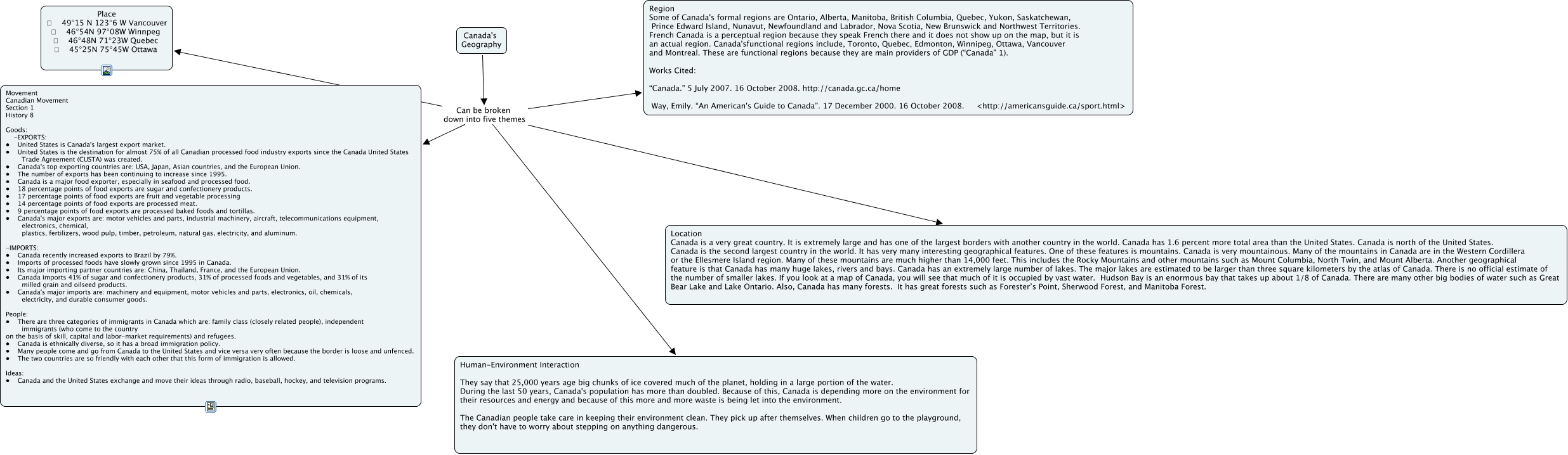 This Concept Map, created with IHMC CmapTools, has information related to: Canada's Geography(1), Canada's Geography Can be broken down into five themes Region Some of Canada's formal regions are Ontario, Alberta, Manitoba, British Columbia, Quebec, Yukon, Saskatchewan, Prince Edward Island, Nunavut, Newfoundland and Labrador, Nova Scotia, New Brunswick and Northwest Territories. French Canada is a perceptual region because they speak French there and it does not show up on the map, but it is an actual region. Canada'sfunctional regions include, Toronto, Quebec, Edmonton, Winnipeg, Ottawa, Vancouver and Montreal. These are functional regions because they are main providers of GDP (“Canada" 1). Works Cited: “Canada.” 5 July 2007. 16 October 2008. http://canada.gc.ca/home Way, Emily. “An American's Guide to Canada”. 17 December 2000. 16 October 2008. <http://americansguide.ca/sport.html>, Canada's Geography Can be broken down into five themes Movement Canadian Movement Section 1 History 8 Goods: -EXPORTS: • United States is Canada's largest export market. • United States is the destination for almost 75% of all Canadian processed food industry exports since the Canada United States Trade Agreement (CUSTA) was created. • Canada's top exporting countries are: USA, Japan, Asian countries, and the European Union. • The number of exports has been continuing to increase since 1995. • Canada is a major food exporter, especially in seafood and processed food. • 18 percentage points of food exports are sugar and confectionery products. • 17 percentage points of food exports are fruit and vegetable processing • 14 percentage points of food exports are processed meat. • 9 percentage points of food exports are processed baked foods and tortillas. • Canada's major exports are: motor vehicles and parts, industrial machinery, aircraft, telecommunications equipment, electronics, chemical, plastics, fertilizers, wood pulp, timber, petroleum, natural gas, electricity, and aluminum. -IMPORTS: • Canada recently increased exports to Brazil by 79%. • Imports of processed foods have slowly grown since 1995 in Canada. • Its major importing partner countries are: China, Thailand, France, and the European Union. • Canada imports 41% of sugar and confectionery products, 31% of processed foods and vegetables, and 31% of its milled grain and oilseed products. • Canada's major imports are: machinery and equipment, motor vehicles and parts, electronics, oil, chemicals, electricity, and durable consumer goods. People: • There are three categories of immigrants in Canada which are: family class (closely related people), independent immigrants (who come to the country on the basis of skill, capital and labor-market requirements) and refugees. • Canada is ethnically diverse, so it has a broad immigration policy. • Many people come and go from Canada to the United States and vice versa very often because the border is loose and unfenced. • The two countries are so friendly with each other that this form of immigration is allowed. Ideas: • Canada and the United States exchange and move their ideas through radio, baseball, hockey, and television programs., Canada's Geography Can be broken down into five themes Human-Environment Interaction They say that 25,000 years age big chunks of ice covered much of the planet, holding in a large portion of the water. During the last 50 years, Canada's population has more than doubled. Because of this, Canada is depending more on the environment for their resources and energy and because of this more and more waste is being let into the environment. The Canadian people take care in keeping their environment clean. They pick up after themselves. When children go to the playground, they don't have to worry about stepping on anything dangerous., Canada's Geography Can be broken down into five themes Place 49°15 N 123°6 W Vancouver 46°54N 97°08W Winnpeg 46°48N 71°23W Quebec 45°25N 75°45W Ottawa, Canada's Geography Can be broken down into five themes Location Canada is a very great country. It is extremely large and has one of the largest borders with another country in the world. Canada has 1.6 percent more total area than the United States. Canada is north of the United States. Canada is the second largest country in the world. It has very many interesting geographical features. One of these features is mountains. Canada is very mountainous. Many of the mountains in Canada are in the Western Cordillera or the Ellesmere Island region. Many of these mountains are much higher than 14,000 feet. This includes the Rocky Mountains and other mountains such as Mount Columbia, North Twin, and Mount Alberta. Another geographical feature is that Canada has many huge lakes, rivers and bays. Canada has an extremely large number of lakes. The major lakes are estimated to be larger than three square kilometers by the atlas of Canada. There is no official estimate of the number of smaller lakes. If you look at a map of Canada, you will see that much of it is occupied by vast water. Hudson Bay is an enormous bay that takes up about 1/8 of Canada. There are many other big bodies of water such as Great Bear Lake and Lake Ontario. Also, Canada has many forests. It has great forests such as Forester’s Point, Sherwood Forest, and Manitoba Forest.
