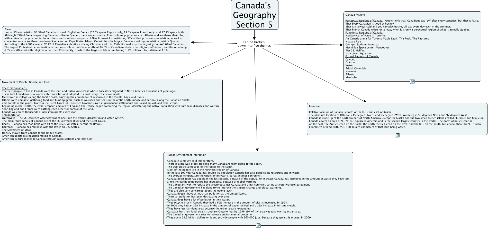 This Concept Map, created with IHMC CmapTools, has information related to: Canada's Geography(5), Canada's Geography Section 5 Can be broken down into five themes Location Relative location of Canada is north of the U. S. and east of Russia. The absolute location of Ottawa is 45 degrees North and 75 degrees West. Winnipeg is 50 degrees North and 97 degrees West. Canada is made up of the northern part of North America, except for Alaska and the two small French islands called St. Pierre and Miquelon. Canada covers an area of 9,976,140 square kilometers and is the second largest country in the world.. The north Atlantic Ocean is on the east, the Arctic Ocean on the north, the north Pacific Ocean on the west, and the U.S. on the south. In Canada, there are 9.9 square kilometers of land, with 755, 170 square kilometers of that land being water., Canada's Geography Section 5 Can be broken down into five themes Movement of People, Goods, and Ideas The First Canadians The first people to live in Canada were the Inuit and Native Americans whose ancestors migrated to North America thousands of years ago. These first Canadians developed stable societies and adapted to a wide range of environments. Many lived in villages along the Pacific coast, enjoying the abundance of resources in the forests, bays, and rivers. Others were nomadic, gathering food and hunting game, such as walruses and seals in the arctic north, moose and caribou along the Canadian Shield, and buffalo in the plains. Many in the Great Lakes-St. Lawrence Lowlands lived in permanent settlements and raised squash and other crops. Beginning in the 1600s, the rival European empires of England and France began colonizing the region, devastating the native population with European diseases and warfare. Soon England and France were battling each other for control of the land. Canada welcomes thousands of new immigrants every year. Transportation Waterways – The St. Lawrence waterway was at one time the world's greatest inland water system. The main route canals of Canada are of the St. Lawrence River and the Great Lakes. Roads – Canada has road links with all of the U.S.'s 50 states, except for Hawaii. Railroads – Canada has rail links with the lower 48 U.S. States. The Movement of Ideas Hockey moved from Canada to the United States. American sports like baseball moved to Canada. American culture moves to Canada through radio stations and television., Canada's Geography Section 5 Can be broken down into five themes Canada Regions Perceptual Regions of Canada: People think that Canadians say “ey” after every sentence, but that is False. That Every Canadian is good at hockey That it is always cold and you can play hockey all day every day even in the summer. That French Canada exists on a map, when it is only a perceptual region of what is actually Quebec. Functional Regions of Canada: Hockey Hall of Fame in Toronto. Air Canada arena for Toronto Maple Leafs, The Rock, The Raptures. Niagara Falls Olympic Stadium, Montreal MacMillan Space center, Vancouver Pier 21, Halifax Vancouver Aquarium Formal Regions of Canada: Quebec Ontario Yukon British Columbia Nunavut Alberta Manitoba, Canada's Geography Section 5 Can be broken down into five themes Place Human Characteristics: 98.5% of Canadians speak English or French (67.5% speak English only, 13.3% speak French only, and 17.7% speak both. Although 85% of French-speaking Canadians live in Quebec, there are substantial Francophone populations in , Alberta and southern Manitoba, with an Acadian population in the northern and southeastern parts of New Brunswick constituting 35% of that province's population, as well as concentrations in southwestern Nova Scotia and on Cape Breton Island. Ontario has the largest French-speaking population outside Quebec. According to the 2001 census, 77.1% of Canadians identify as being Christians; of this, Catholics make up the largest group (43.6% of Canadians). The largest Protestant denomination is the United Church of Canada. About 16.5% of Canadians declare no religious affiliation, and the remaining 6.3% are affiliated with religions other than Christianity, of which the largest is Islam numbering 1.9%, followed by Judaism at 1.1%., Canada's Geography Section 5 Can be broken down into five themes Human Environment Interaction -Canada is a mostly cold temperature. -There is a big wall of ice blocking many Canadians from going to the south. -The wall blocks almost all of the routes to the south. -Most of the people live in the northeast region of Canada. -In the last 100 year Canada has double its population Canada has also doubled its resources and in waste. -The average temperature the whole entire year is 33.08 degrees Fahrenheit. -Canada population has double in the last decade, because of the population increase Canada has increased in the amount of waste they have too. -Since the earths temperature has increased, because of global warming -The Canadians want to reduce the greenhouse gas Canada and other countries set up a Kyoto Protocol agreement. -The Canadian government has done try to improve the climate change and global warming. -They are also very concerned about the ozone layer. -Canada doesn't have as much air pollution as the United States. -There air pollution has been decreasing over time. -Canada does have a lot of pollution in their water. -They recycle a lot in Canada they had a 60% increase in the amount of plastic increased in 1998. -In 2000 they had an 39% increase in the amount of paper recyled and a 25% increase in ferrous metals. -They have less farmland area because the urban area is expanding. -Canada's best farmland area is southern Ontario, but by 1996 19% of the area was take over by urban area. -The Canadian government tries to increase environmental protection. -They spent 14.5 billion dollars on it and provide people with 160,000 jobs, because they gave this money, in 2000.