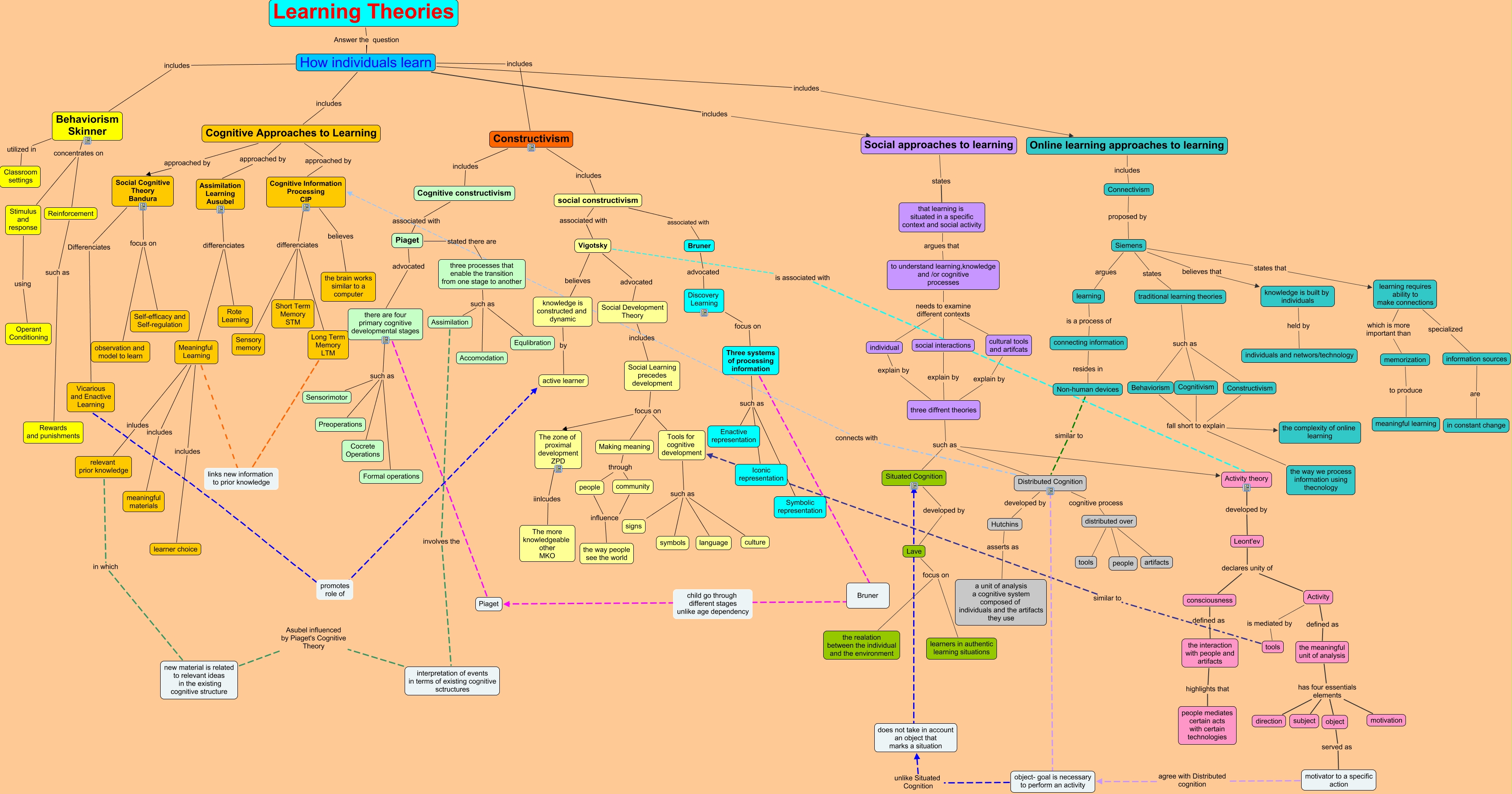 This Concept Map, created with IHMC CmapTools, has information related to: second draft- Learning theories, memorization to produce meaningful learning, there are four primary cognitive developmental stages ???? Piaget, Constructivism includes Cognitive constructivism, Vicarious and Enactive Learning ???? promotes role of, learning requires ability to make connections specialized information sources, does not take in account an object that marks a situation ???? Situated Cognition, Tools for cognitive development such as symbols, knowledge is built by individuals held by individuals and networs/technology, Lave focus on learners in authentic learning situations, traditional learning theories such as Cognitivism, Behaviorism Skinner utilized in Classroom settings, Leont'ev declares unity of Activity, Cognitive Information Processing CIP differenciates Sensory memory, knowledge is constructed and dynamic by active learner, connecting information resides in Non-human devices, to understand learning,knowledge and /or cognitive processes needs to examine different contexts social interactions, cultural tools and artifcats explain by three diffrent theories, Three systems of processing information such as Symbolic representation, Assimilation involves the interpretation of events in terms of existing cognitive sctructures, learning is a process of connecting information