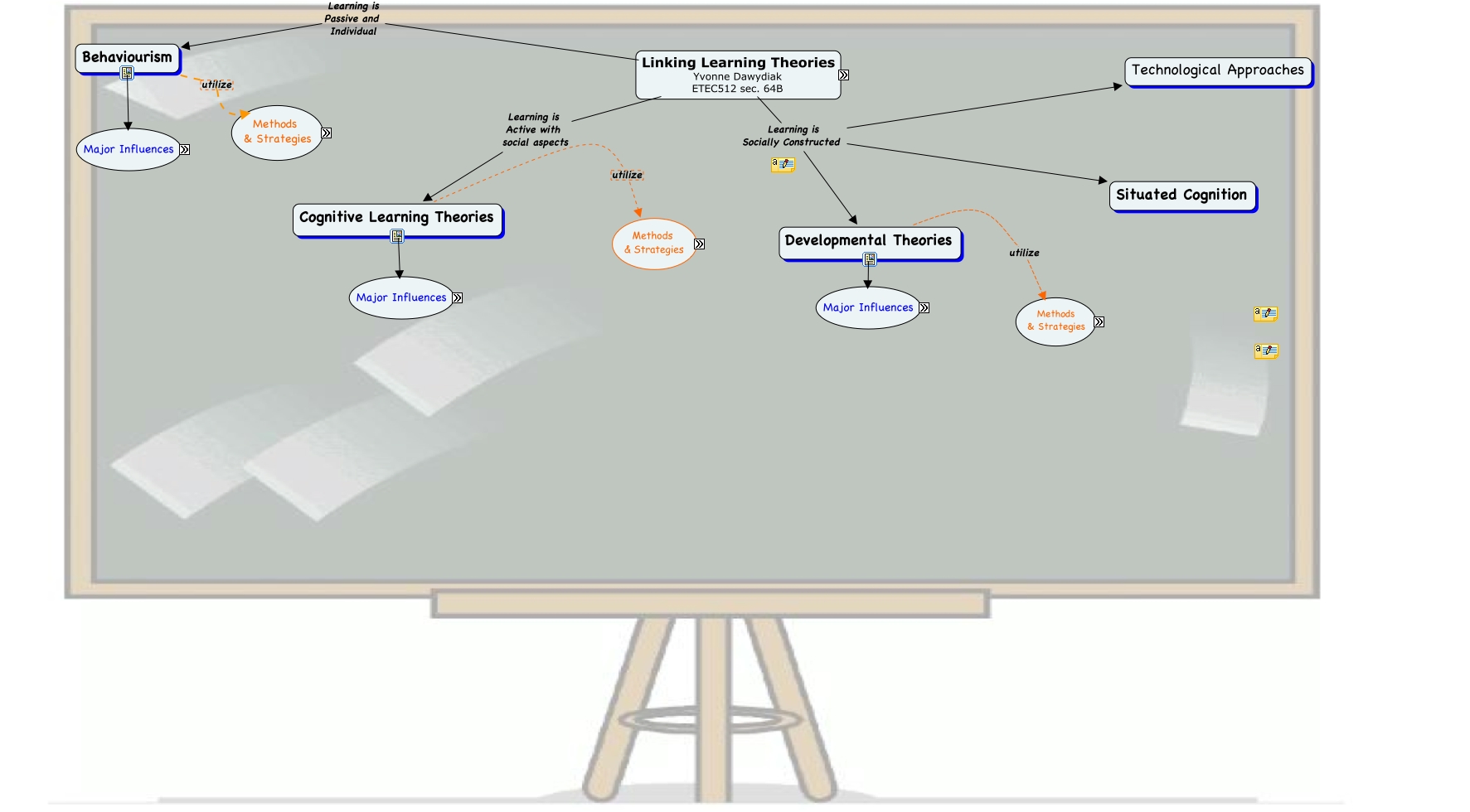This Concept Map, created with IHMC CmapTools, has information related to: Revised learning theories-2a, Piaget's Stage Theory stages are sequential, Cognitive Learning Theories major influences Ausubel, Cognitive Learning Strategies include Note-taking, Educators to meet the needs of Learners, chunking into 7 items at a time, sensorimotor characterized by ????, concrete operations 11 - 15 years formal operations, Developmental Methods & Strategies include constructivist methods, Assessment leading to reinforcement, sensorimotor 2 - 7 years Pre-operational, Modeling both direct, concrete operations characterized by ????, mnemonic devices including acrostics, Piaget's Stage Theory 0 - 2 years sensorimotor, Piaget's Stage Theory stages are universal, Pre-operational 7 - 11 years concrete operations, Skinner employed operant conditioning, Behaviourism major influences Pavlov, Learning Theories Learning is Socially Constructed Developmental Theories, include strategies employed by Educators