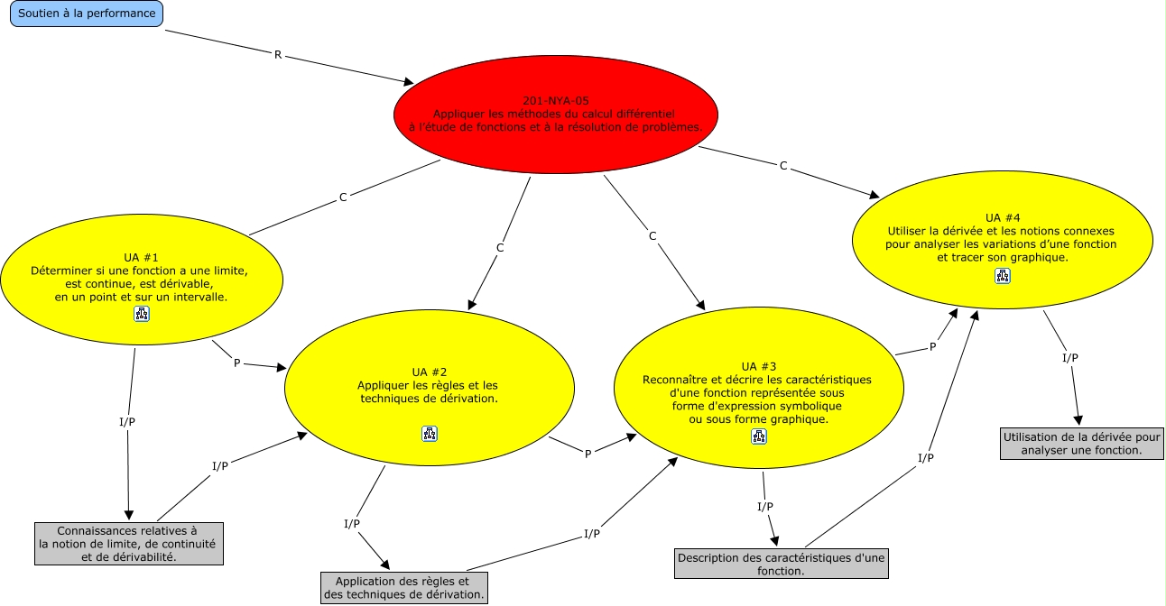 Cette carte conceptuelle, cree avec IHMC CmapTools, contient des informations liees a : SA, UA #3 Reconnaître et décrire les caractéristiques d'une fonction représentée sous forme d'expression symbolique ou sous forme graphique. P UA #4 Utiliser la dérivée et les notions connexes pour analyser les variations d’une fonction et tracer son graphique., Soutien à la performance R 201-NYA-05 Appliquer les méthodes du calcul différentiel à l’étude de fonctions et à la résolution de problèmes., 201-NYA-05 Appliquer les méthodes du calcul différentiel à l’étude de fonctions et à la résolution de problèmes. C UA #3 Reconnaître et décrire les caractéristiques d'une fonction représentée sous forme d'expression symbolique ou sous forme graphique., 201-NYA-05 Appliquer les méthodes du calcul différentiel à l’étude de fonctions et à la résolution de problèmes. C UA #2 Appliquer les règles et les techniques de dérivation., UA #1 Déterminer si une fonction a une limite, est continue, est dérivable, en un point et sur un intervalle. I/P Connaissances relatives à la notion de limite, de continuité et de dérivabilité., UA #3 Reconnaître et décrire les caractéristiques d'une fonction représentée sous forme d'expression symbolique ou sous forme graphique. I/P Description des caractéristiques d'une fonction., UA #1 Déterminer si une fonction a une limite, est continue, est dérivable, en un point et sur un intervalle. P UA #2 Appliquer les règles et les techniques de dérivation., UA #2 Appliquer les règles et les techniques de dérivation. I/P Application des règles et des techniques de dérivation., UA #2 Appliquer les règles et les techniques de dérivation. P UA #3 Reconnaître et décrire les caractéristiques d'une fonction représentée sous forme d'expression symbolique ou sous forme graphique., UA #4 Utiliser la dérivée et les notions connexes pour analyser les variations d’une fonction et tracer son graphique. I/P Utilisation de la dérivée pour analyser une fonction., 201-NYA-05 Appliquer les méthodes du calcul différentiel à l’étude de fonctions et à la résolution de problèmes. C UA #4 Utiliser la dérivée et les notions connexes pour analyser les variations d’une fonction et tracer son graphique., Description des caractéristiques d'une fonction. I/P UA #4 Utiliser la dérivée et les notions connexes pour analyser les variations d’une fonction et tracer son graphique., Application des règles et des techniques de dérivation. I/P UA #3 Reconnaître et décrire les caractéristiques d'une fonction représentée sous forme d'expression symbolique ou sous forme graphique., 201-NYA-05 Appliquer les méthodes du calcul différentiel à l’étude de fonctions et à la résolution de problèmes. C UA #1 Déterminer si une fonction a une limite, est continue, est dérivable, en un point et sur un intervalle., Connaissances relatives à la notion de limite, de continuité et de dérivabilité. I/P UA #2 Appliquer les règles et les techniques de dérivation.