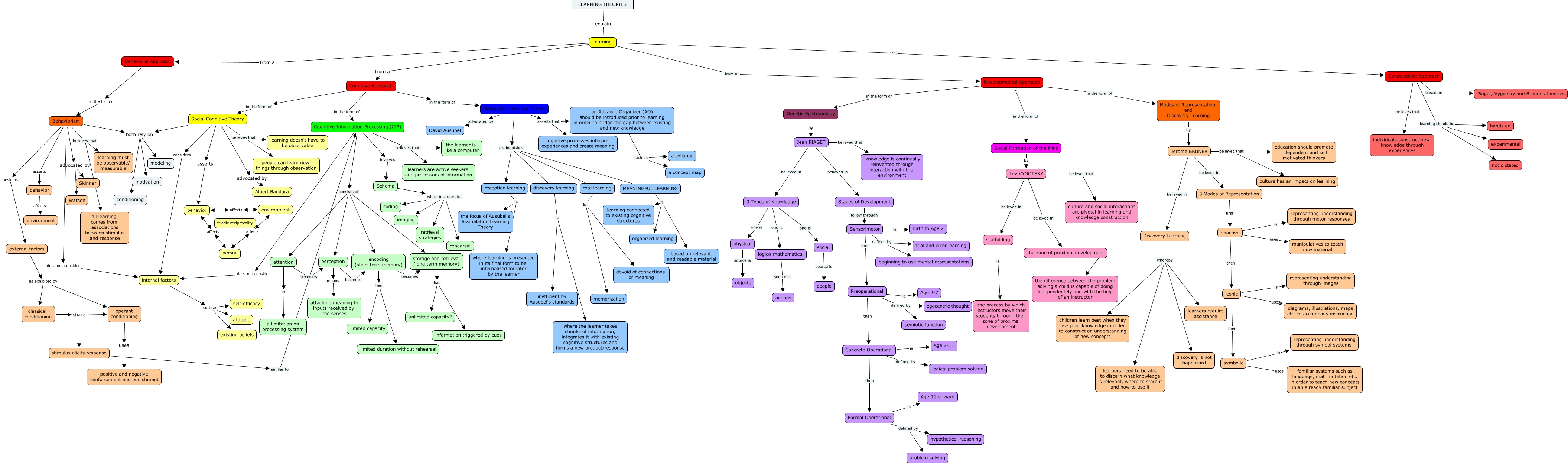 This Concept Map, created with IHMC CmapTools, has information related to: Rachel Bronk.Concept Map Draft 2, Preoperational defined by egocentric thought, iconic then symbolic, Behaviorism advocated by Skinner, perception means attaching meaning to inputs received by the senses, encoding (short term memory) becomes storage and retrieval (long term memory), Behaviorism both rely on conditioning, Formal Operational defined by problem solving, Meaningful Learning Theory advocated by David Ausubel, storage and retrieval (long term memory) has information triggered by cues, Behaviorism both rely on modeling, Cognitive Approach in the form of Cognitive Information Processing (CIP), internal factors such as self-efficacy, physical source is objects, Jerome BRUNER believed that education should promote independent and self motivated thinkers, Discovery Learning whereby learners need to be able to discern what knowledge is relevant, where to store it and how to use it, Formal Operational defined by hypothetical reasoning, Social Cognitive Theory both rely on conditioning, discovery learning is where the learner takes chunks of information, integrates it with existing cognitive structures and forms a new product/response, Behaviorism advocated by Watson, environment affects person