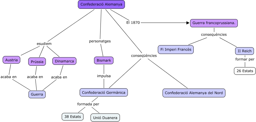 Aquest mapa conceptual conté informació relacionada amb: Confederacio Alemanya, II Reich formar per 26 Estats, Confederació Alemanya personatges Bismark, Confederació Alemanya esudiem Prússia, Dinamarca acaba en Guerra, Guerra francoprussiana. consequències Fi Imperi Francès, Confederació Alemanya conseqüències Confederació Germànica, Confederació Alemanya esudiem Dinamarca, Prússia acaba en Guerra, Austria acaba en Guerra, Confederació Alemanya esudiem Austria, Confederació Germànica formada per Unió Duanera, Confederació Alemanya conseqüències Confederació Alemanya del Nord, Confederació Germànica formada per 38 Estats, Guerra francoprussiana. consequències II Reich, Confederació Alemanya El 1870 Guerra francoprussiana., Bismark impulsa Confederació Germànica