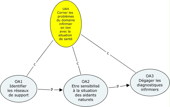 Cette carte conceptuelle, cree avec IHMC CmapTools, contient des informations liees a : UA4, UA4 Cerner les problèmes du domaine infirmier en lien avec la situation de santé c OA1 Identifier les réseaux de support, OA1 Identifier les réseaux de support p OA2 Etre sensibilisé à la situation des aidants naturels, UA4 Cerner les problèmes du domaine infirmier en lien avec la situation de santé c OA3 Dégager les diagnostiques infirmiers, UA4 Cerner les problèmes du domaine infirmier en lien avec la situation de santé c OA2 Etre sensibilisé à la situation des aidants naturels, OA2 Etre sensibilisé à la situation des aidants naturels p OA3 Dégager les diagnostiques infirmiers
