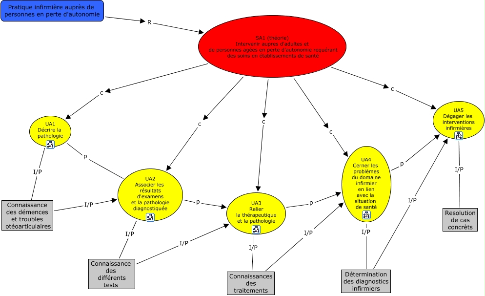 Cette carte conceptuelle, cree avec IHMC CmapTools, contient des informations liees a : SA1theorie, UA4 Cerner les problèmes du domaine infirmier en lien avec la situation de santé I/P Détermination des diagnostics infirmiers, Connaissance des différents tests I/P UA3 Relier la thérapeutique et la pathologie, UA1 Décrire la pathologie I/P Connaissance des démences et troubles otéoarticulaires, Connaissances des traitements I/P UA4 Cerner les problèmes du domaine infirmier en lien avec la situation de santé, UA3 Relier la thérapeutique et la pathologie p UA4 Cerner les problèmes du domaine infirmier en lien avec la situation de santé, UA5 Dégager les interventions infirmières I/P Resolution de cas concrèts, Détermination des diagnostics infirmiers I/P UA5 Dégager les interventions infirmières, SA1 (théorie) Intervenir aupres d'adultes et de personnes agées en perte d'autonomie requérant des soins en établissements de santé c UA1 Décrire la pathologie, Pratique infirmière auprès de personnes en perte d'autonomie R SA1 (théorie) Intervenir aupres d'adultes et de personnes agées en perte d'autonomie requérant des soins en établissements de santé, SA1 (théorie) Intervenir aupres d'adultes et de personnes agées en perte d'autonomie requérant des soins en établissements de santé c UA3 Relier la thérapeutique et la pathologie, SA1 (théorie) Intervenir aupres d'adultes et de personnes agées en perte d'autonomie requérant des soins en établissements de santé c UA2 Associer les résultats d'examens et la pathologie diagnostiquée, UA2 Associer les résultats d'examens et la pathologie diagnostiquée p UA3 Relier la thérapeutique et la pathologie, UA4 Cerner les problèmes du domaine infirmier en lien avec la situation de santé p UA5 Dégager les interventions infirmières, UA2 Associer les résultats d'examens et la pathologie diagnostiquée I/P Connaissance des différents tests, SA1 (théorie) Intervenir aupres d'adultes et de personnes agées en perte d'autonomie requérant des soins en établissements de santé c UA4 Cerner les problèmes du domaine infirmier en lien avec la situation de santé, UA1 Décrire la pathologie p UA2 Associer les résultats d'examens et la pathologie diagnostiquée, SA1 (théorie) Intervenir aupres d'adultes et de personnes agées en perte d'autonomie requérant des soins en établissements de santé c UA5 Dégager les interventions infirmières, Connaissance des démences et troubles otéoarticulaires I/P UA2 Associer les résultats d'examens et la pathologie diagnostiquée, UA3 Relier la thérapeutique et la pathologie I/P Connaissances des traitements