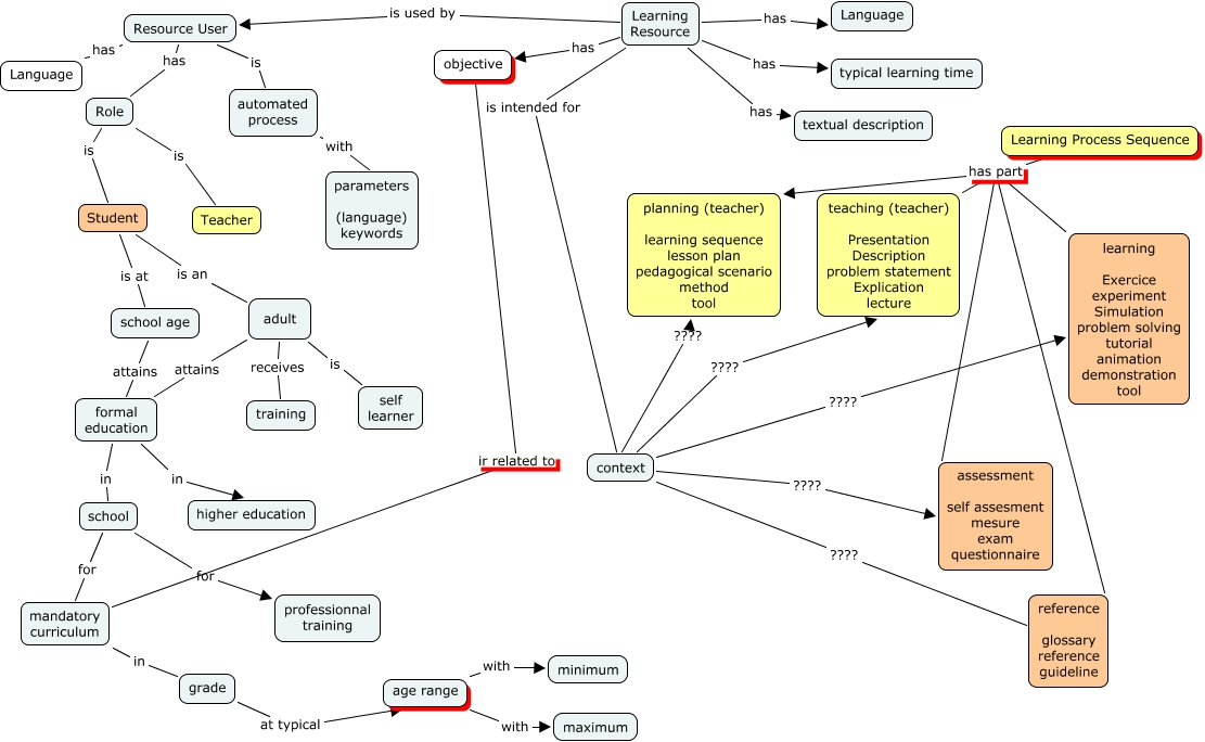 This Concept Map, created with IHMC CmapTools, has information related to: PJG_v1_Tore, Learning Resource is used by Resource User, Student is at school age, Learning Process Sequence has part planning (teacher) learning sequence lesson plan pedagogical scenario method tool, adult is self learner, grade at typical age range, adult attains formal education, school for professionnal training, context ???? assessment self assesment mesure exam questionnaire, Learning Process Sequence has part reference glossary reference guideline, Resource User has Role, school age attains formal education, context ???? teaching (teacher) Presentation Description problem statement Explication lecture, Learning Resource has objective, Resource User is automated process, formal education in higher education, Role is Student, Student is an adult, Learning Resource has textual description, age range with maximum, Learning Process Sequence has part teaching (teacher) Presentation Description problem statement Explication lecture