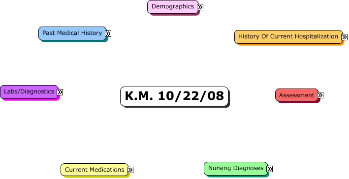 This Concept Map, created with IHMC CmapTools, has information related to: 10-22 CMAP Caddle, Ibuprofen Classification NSAID, Antipyretic, Nonopiod analgesic, Propionic acid derivative, Omeprazole Reason for Recieving To reduce gastric acid, Omeprazole Nursing Indications Assess the GI system, administer before eating, Calcitonin Brand Name Miacalcin, Osteocalcin, CBC 10/22 WBC=8.2 RBC=3.07 Hgb=9.1 Hct=27.2 Plt=247, Aspirin Physician's Order 81mg PO daily, Tolterodine Reason for Recieving Overactive bladder Muscarinic receptor antagonist, Tizanidine Brand Name Zanaflex, Tizanidine Physician's Order 1mg PO BID, Levothyroxine Nursing Indications Obtain daily weight, BP and pulse periodically. Administer at the same time each day., Urinalysis 10/21 Straw, Clear, Specific gravity=1.014 pH=6 Negative: protein, glucose, ketones, bilirubin, hgb, nitrites, RBC Urobilinogenɚ.0, Leukest=small, WBC=0-5 Epithelial=few, Vital Signs 15:00 Temp:36.5 Orthostatic BPs Lying:122/57 HR:80 Sitting:140/56 HR:80 Standing:101/58 HR:83 Resp:18 SpO2:99% 3L NC Pain:9/10, Calcitonin Reason for Recieving Postmenopausal osteoporosis, CBC 10/21 WBC=18 RBC=3.49 Hgb=10.5 Hct=30.8 Plt=296, Ibuprofen Reason for Recieving Pain relief, Cardiovascular 15:00 Heart rate 80BPM. No JVD. No carotid bruit. S1 and S2 sounds heard. Radial and pedal pulses palpable, regular, +2. No edema. Capillary refill ɛsec., Aspirin Nursing Indications Increased bleeding risk, take with food or milk to decrease GI upset., Lidocaine Reason for Recieving Pain relief, Deficient fluid volume related to insufficient intake as evidenced by postural hypotension. Intervention Monitor orthostatic vital signs Q shift., Blood Culture 10/21 No growth ឈ hr.