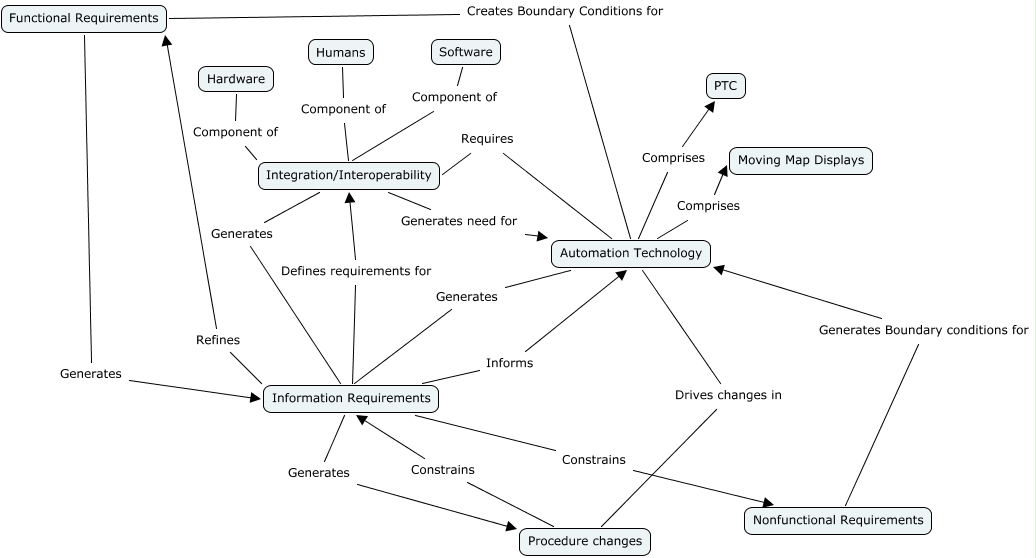 This Concept Map, created with IHMC CmapTools, has information related to: FRA Research elements, Humans Component of Integration/Interoperability, Automation Technology Generates Information Requirements, Information Requirements Defines requirements for Integration/Interoperability, Integration/Interoperability Generates need for Automation Technology, Functional Requirements Generates Information Requirements, Nonfunctional Requirements Generates Boundary conditions for Automation Technology, Software Component of Integration/Interoperability, Information Requirements Constrains Nonfunctional Requirements, Automation Technology Comprises PTC, Automation Technology Drives changes in Procedure changes, Hardware Component of Integration/Interoperability, Information Requirements Generates Procedure changes, Integration/Interoperability Generates Information Requirements, Procedure changes Constrains Information Requirements, Information Requirements Refines Functional Requirements, Information Requirements Informs Automation Technology, Automation Technology Requires Integration/Interoperability, Automation Technology Comprises Moving Map Displays, Functional Requirements Creates Boundary Conditions for Automation Technology