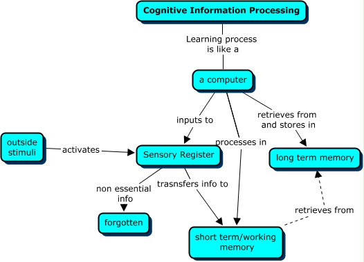 This Concept Map, created with IHMC CmapTools, has information related to: Gioia-CIP, a computer processes in short term/working memory, Cognitive Information Processing Learning process is like a a computer, a computer retrieves from and stores in long term memory, Sensory Register non essential info forgotten, Sensory Register trasnsfers info to short term/working memory, a computer inputs to Sensory Register, short term/working memory retrieves from long term memory, outside stimuli activates Sensory Register