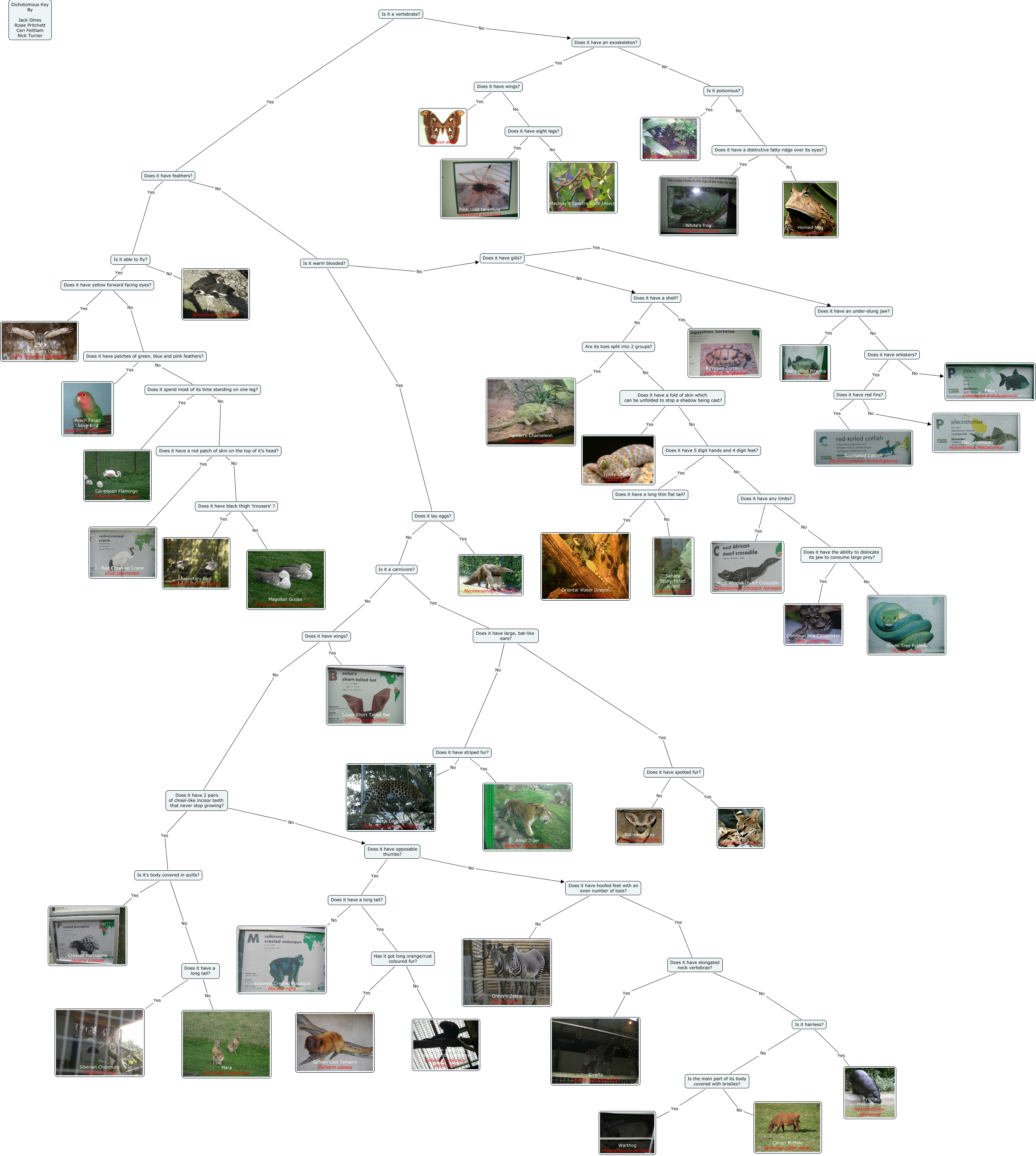 This Concept Map, created with IHMC CmapTools, has information related to: final key, Does it have an exoskeleton? No Is it poisonous?, Is it poisonous? Yes Poison Arrow frog Dendrobates leucomelus, Is it able to fly? Yes Does it have yellow forward facing eyes?, Is it poisonous? No Does it have a distinctive fatty ridge over its eyes?, Does it have patches of green, blue and pink feathers? Yes Peach Faced Love Bird Agapornis roseicollis, Is it's body covered in quills? Yes Crested Porcupine Hystrix cristata, Does it have a long tail? Yes Has it got long orange/rust coloured fur?, Is it hairless? Yes Pygmy Hippotamus Hexaprotodon liberiensis, Is it a carnivore? Yes Does it have large, bat-like ears?, Does it have 5 digit hands and 4 digit feet? Yes Does it have a long thin flat tail?, Does it have 5 digit hands and 4 digit feet? No Does it have any limbs?, Does it have red fins? Yes Red-tailed Catfish Phractocephalus hemioliopterus, Has it got long orange/rust coloured fur? No Western black and white Colobus Monkey Colobus polykomos polykomos, Does it have elongated neck vertebrae? Yes Giraffe Giraffa camelopardalis, Does it have 2 pairs of chisel-like incisor teeth that never stop growing? No Does it have opposable thumbs?, Does it have a long tail? No Sulawesi Crested Macaque Macaca nigra, Does it have a long thin flat tail? No Sahara Spiny-tailed Lizard Uromastyx geyri, Does it have black thigh 'trousers' ? Yes Secretary Bird Sagittarius serpentarius, Is it a vertebrate? Yes Does it have feathers?, Does it have feathers? Yes Is it able to fly?