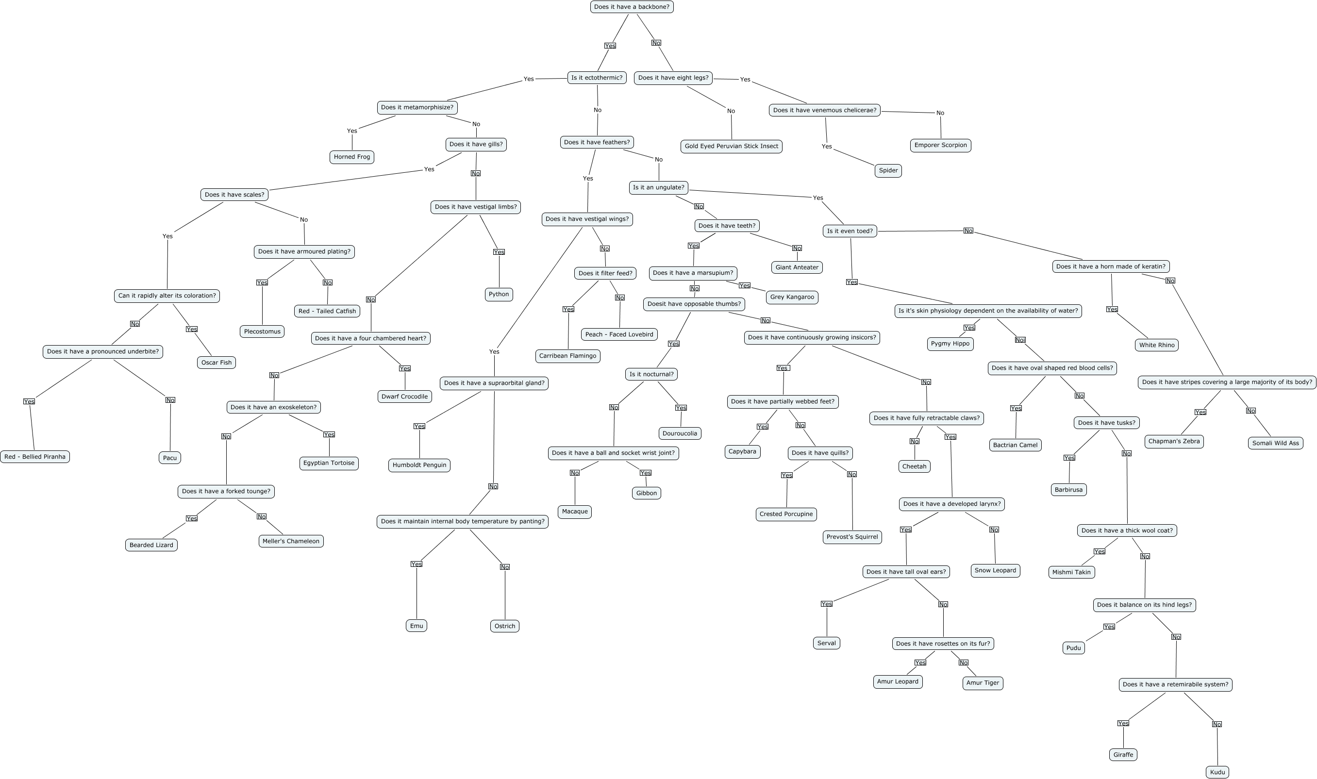 This Concept Map, created with IHMC CmapTools, has information related to: marwell thing test, Does it have a four chambered heart? Yes Dwarf Crocodile, Does it have vestigal wings? Yes Does it have a supraorbital gland?, Does it have gills? Yes Does it have scales?, Does it have scales? No Does it have armoured plating?, Does it have a horn made of keratin? Yes White Rhino, Doesit have opposable thumbs? Yes Is it nocturnal?, Does it maintain internal body temperature by panting? Yes Emu, Does it have a four chambered heart? No Does it have an exoskeleton?, Does it have feathers? Yes Does it have vestigal wings?, Does it have a ball and socket wrist joint? No Macaque, Does it filter feed? Yes Carribean Flamingo, Does it have tusks? Yes Barbirusa, Does it have teeth? Yes Does it have a marsupium?, Does it have an exoskeleton? Yes Egyptian Tortoise, Does it have a marsupium? Yes Grey Kangaroo, Is it nocturnal? No Does it have a ball and socket wrist joint?, Does it have a developed larynx? No Snow Leopard, Does it have an exoskeleton? No Does it have a forked tounge?, Does it have armoured plating? No Red - Tailed Catfish, Does it have partially webbed feet? Yes Capybara