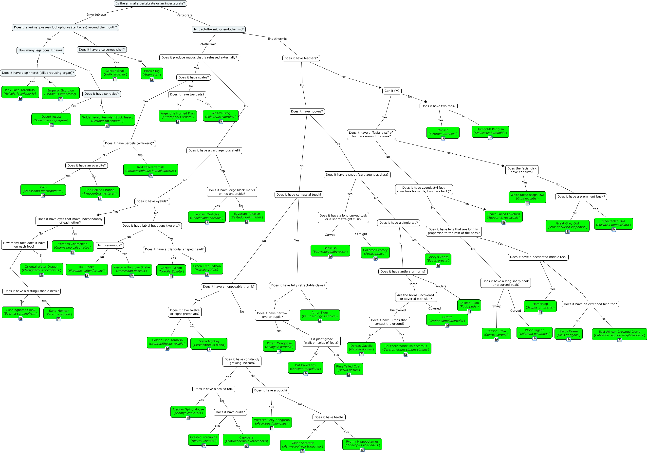 This Concept Map, created with IHMC CmapTools, has information related to: Draft Marwell map, Does it have quills? No Capybara (Hydrochoerus hydrochaeris), Does it have a scaled tail? Yes Arabian Spiny Mouse (Acomys cahirunis), Does it have scales? No Does it have toe pads?, Are the horns uncovered or covered with skin? Uncovered Does it have 3 toes that contact the ground?, Does it have twelve or eight premolars? 8 Golden Lion Tamarin (Leontopithecus rosalia), Does it have quills? Yes Crested Porcupine (Hystrix cristata), Does it have a single toe? No Does it have antlers or horns?, Does it have two toes? No Humboldt Penguin (Speniscus humboldt), Can it fly? No Does it have two toes?, Does it have an extended hind toe? No Sarus Crane (Grus antigore), Does it have carnassial teeth? Yes Does it have fully retractable claws?, Does it have a scaled tail? No Does it have quills?, Does it have a long sharp beak or a curved beak? Sharp Carrion Crow (Corvus corone), Does it have carnassial teeth? No Does it have an opposable thumb?, Does it have a pouch? Yes Western Grey Kangaroo (Macropus fulignosus), Does the facial disk have ear tufts? Yes White faced scops Owl (Otus leucatis), Is the animal a vertebrate or an invertebrate? Invertebrate Does the animal possess lophophores (tentacles) around the mouth?, Does it have a pectinated middle toe? Yes Hamerkop (Scopus umbretta), Does it have spiracles? Yes Desert locust (Schistocerca gregaria), Does it have feathers? Yes Can it fly?