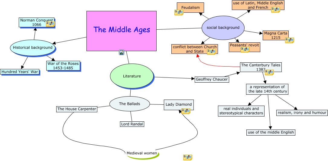 Questa Cmap, creata con IHMC CmapTools, contiene informazioni relative a: The Middle Ages, Historical background Norman Conquest 1066, social background Magna Carta 1215, The Ballads The House Carpenter, a representation of the late 14th century use of the middle English, a representation of the late 14th century real individuals and stereotypical characters, The Middle Ages Literature, Literature The Ballads, The Ballads Lady Diamond, social background conflict between Church and State, The Middle Ages social background, The Ballads Lord Randal, Literature Geoffrey Chaucer, a representation of the late 14th century realism, irony and humour, Geoffrey Chaucer The Canterbury Tales 1387, The Canterbury Tales 1387 conflict between Church and State, Historical background Hundred Years' War, The House Carpenter Medieval women Lady Diamond, social background use of Latin, Middle English and French, social background Peasants' revolt 1381, The Canterbury Tales 1387 a representation of the late 14th century