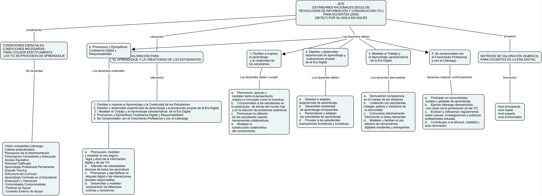 Este Cmap, tiene información relacionada con: tarea 2 de victor, ISTE ESTÁNDARES NACIONALES (EEUU) DE TECNOLOGÍAS DE INFORMACIÓN Y COMUNICACIÓN (TIC) PARA DOCENTES (2008) (NETS•T) POR SU SIGLA EN INGLÉS Los docentes deben 4. Promueven y Ejemplifican Ciudadanía Digital y Responsabilidad, ISTE ESTÁNDARES NACIONALES (EEUU) DE TECNOLOGÍAS DE INFORMACIÓN Y COMUNICACIÓN (TIC) PARA DOCENTES (2008) (NETS•T) POR SU SIGLA EN INGLÉS condiciones CONDICIONES ESENCIALES CONDICIONES NECESARIAS PARA UTILIZAR EFECTIVAMENTE LAS TIC EN PROCESOS DE APRENDIZAJE, 1. Facilitan e inspiran el aprendizaje y la creatividad de los estudiantes Los docentes deben cumplir a. Promueven, apoyan y modelan tanto el pensamiento creativo e innovador como la inventiva b. Comprometen a los estudiantes en la exploración de temas del mundo real y en la solución de problemas auténticos c. Promueven la reflexión de los estudiantes usando herramientas colaborativas. d. Modelan la construcción colaborativa del conocimiento., ISTE ESTÁNDARES NACIONALES (EEUU) DE TECNOLOGÍAS DE INFORMACIÓN Y COMUNICACIÓN (TIC) PARA DOCENTES (2008) (NETS•T) POR SU SIGLA EN INGLÉS valoraciòn MATRIZ DE VALORACIÓN PARA EL APRENDIZAJE Y LA CREATIVIDAD DE LOS ESTUDIANTES, ISTE ESTÁNDARES NACIONALES (EEUU) DE TECNOLOGÍAS DE INFORMACIÓN Y COMUNICACIÓN (TIC) PARA DOCENTES (2008) (NETS•T) POR SU SIGLA EN INGLÉS Los docentes deben 3. Modelan el Trabajo y el Aprendizaje característicos de la Era Digital, ISTE ESTÁNDARES NACIONALES (EEUU) DE TECNOLOGÍAS DE INFORMACIÓN Y COMUNICACIÓN (TIC) PARA DOCENTES (2008) (NETS•T) POR SU SIGLA EN INGLÉS Los docentes deben 5. Se comprometen con el Crecimiento Profesional y con el Liderazgo, ISTE ESTÁNDARES NACIONALES (EEUU) DE TECNOLOGÍAS DE INFORMACIÓN Y COMUNICACIÓN (TIC) PARA DOCENTES (2008) (NETS•T) POR SU SIGLA EN INGLÉS Los docentes deben 2. Diseñan y desarrollan experiencias de aprendizaje y evaluaciones propias de la Era Digital, ISTE ESTÁNDARES NACIONALES (EEUU) DE TECNOLOGÍAS DE INFORMACIÓN Y COMUNICACIÓN (TIC) PARA DOCENTES (2008) (NETS•T) POR SU SIGLA EN INGLÉS proyecto MATRICES DE VALORACIÓN (RUBRICS) PARA DOCENTES DE LA ERA DIGITAL, 3. Modelan el Trabajo y el Aprendizaje característicos de la Era Digital Los docentes demuestran a. Demuestran competencia en el manejo de los sistemas b. Colaboran con estudiantes, colegas, padres y miembros de la comunidad c. Comunican efectivamente información e ideas relevantes d. Modelan y facilitan el uso efectivo de herramientas digitales existentes y emergentes, MATRICES DE VALORACIÓN (RUBRICS) PARA DOCENTES DE LA ERA DIGITAL formación nivel principiante nivel medio nivel experto nivel trnsformador, 5. Se comprometen con el Crecimiento Profesional y con el Liderazgo docentes mejoran continuamente a. Participan en comunidades locales y globales de aprendizaje b. Ejercen liderazgo demostrando una visión de la penetración de las TIC c. Evalúan y reflexionan regularmente sobre nuevas investigaciones y prácticas profesionales actuales d. Contribuyen a la eficacia, vitalidad y auto renovación, CONDICIONES ESENCIALES CONDICIONES NECESARIAS PARA UTILIZAR EFECTIVAMENTE LAS TIC EN PROCESOS DE APRENDIZAJE i0s docentes Visión compartida Liderazgo Líderes empoderados Planeación de la Implementación Financiación Consistente y Adecuada Acceso Equitativo Personal Calificado Aprendizaje Profesional Permanente Soporte Técnico Estructura del Currículo Aprendizaje Centrado en el Estudiante Evaluación y Valoración Comunidades Comprometidas Políticas de Apoyo Contexto Externo de Apoyo, MATRIZ DE VALORACIÓN PARA EL APRENDIZAJE Y LA CREATIVIDAD DE LOS ESTUDIANTES valoraciòn 1. Facilitan e Inspiran el Aprendizaje y la Creatividad de los Estudiantes 2. Diseñan y desarrollan experiencias de aprendizaje y evaluaciones propias de la Era Digital 3. Modelan el Trabajo y el Aprendizaje característicos de la Era Digital 4. Promueven y Ejemplifican Ciudadanía Digital y Responsabilidad 5. Se Comprometen con el Crecimiento Profesional y con el Liderazgo, 4. Promueven y Ejemplifican Ciudadanía Digital y Responsabilidad Los docentes entienden a. Promueven, modelan y enseñan el uso seguro, legal y ético de la información digital y de las TIC b. Atienden las necesidades diversas de todos los aprendices c. Promueven y ejemplifican la etiqueta digital y las interacciones sociales responsables d. Desarrollan y modelan comprensión de diferentes culturas y conciencia., ISTE ESTÁNDARES NACIONALES (EEUU) DE TECNOLOGÍAS DE INFORMACIÓN Y COMUNICACIÓN (TIC) PARA DOCENTES (2008) (NETS•T) POR SU SIGLA EN INGLÉS Los docentes deben 1. Facilitan e inspiran el aprendizaje y la creatividad de los estudiantes, 2. Diseñan y desarrollan experiencias de aprendizaje y evaluaciones propias de la Era Digital Los docentes deben a. Diseñan o adaptan experiencias de aprendizaje. b. Desarrollan ambientes de aprendizaje enriquecidos c. Personalizan y adaptan las actividades de aprendizaje d. Proveen a los estudiantes evaluaciones formativas y sumativas,