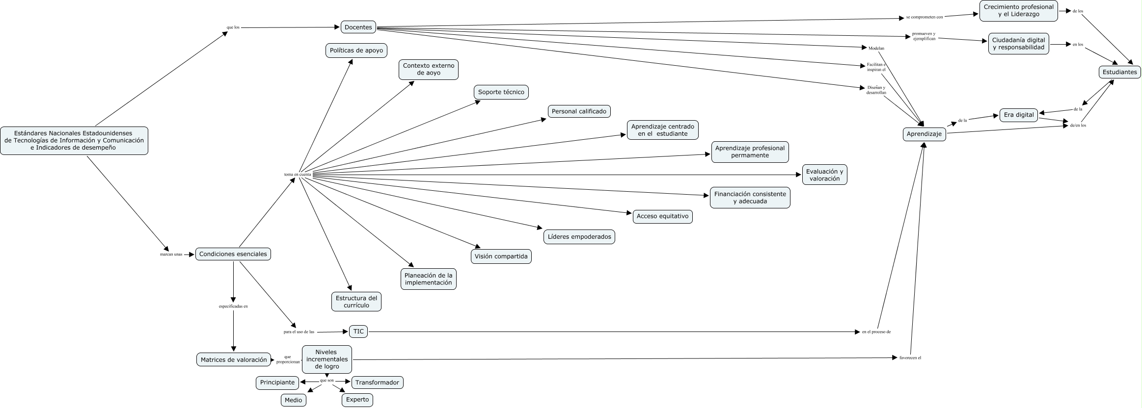 Este Cmap, tiene información relacionada con: hejs_Estándares TIC, Condiciones esenciales toma en cuenta Acceso equitativo, Condiciones esenciales toma en cuenta Políticas de apoyo, Niveles incrementales de logro que son Medio, Crecimiento profesional y el Liderazgo de los Estudiantes, Condiciones esenciales toma en cuenta Planeación de la implementación, Era digital de/en los Estudiantes, Docentes Modelan Aprendizaje, Niveles incrementales de logro favorecen el Aprendizaje, Docentes se comprometen con Crecimiento profesional y el Liderazgo, Condiciones esenciales toma en cuenta Líderes empoderados, Condiciones esenciales toma en cuenta Estructura del currículo, Aprendizaje de la Era digital, Condiciones esenciales especificadas en Matrices de valoración, Condiciones esenciales toma en cuenta Personal calificado, TIC en el proceso de Aprendizaje, Docentes promueven y ejemplifican Ciudadanía digital y responsabilidad, Condiciones esenciales toma en cuenta Visión compartida, Docentes Facilitan e inspiran el Aprendizaje, Condiciones esenciales toma en cuenta Soporte técnico, Niveles incrementales de logro que son Experto