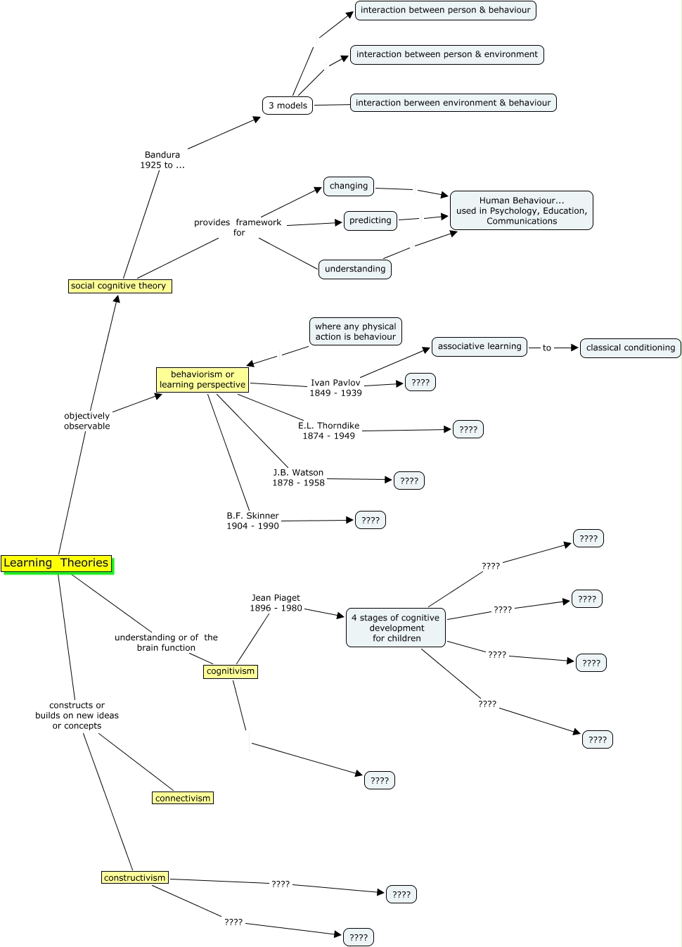 This Concept Map, created with IHMC CmapTools, has information related to: CMap_a - De Pieri, Learning Theories constructs or builds on new ideas or concepts connectivism, 4 stages of cognitive development for children ???? ????, cognitivism Jean Piaget 1896 - 1980 4 stages of cognitive development for children, 4 stages of cognitive development for children ???? ????, constructivism ???? ????, 4 stages of cognitive development for children ???? ????, behaviorism or learning perspective Ivan Pavlov 1849 - 1939 associative learning, associative learning to classical conditioning, 3 models interaction between person & environment, social cognitive theory Bandura 1925 to ... 3 models, behaviorism or learning perspective Ivan Pavlov 1849 - 1939 ????, Learning Theories understanding or of the brain function cognitivism, constructivism ???? ????, Learning Theories objectively observable social cognitive theory, social cognitive theory provides framework for understanding, behaviorism or learning perspective B.F. Skinner 1904 - 1990 ????, 3 models ???? interaction berween environment & behaviour, 3 models interaction between person & behaviour, changing Human Behaviour... used in Psychology, Education, Communications, where any physical action is behaviour behaviorism or learning perspective