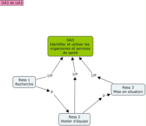 Cette carte conceptuelle, cree avec IHMC CmapTools, contient des informations liees a : OA3 de UA3, Ress 1 Recherche p Ress 2 Atelier d'équipe, Ress 3 Mise en situation I/P OA3 Identifier et utiliser les organismes et services de santé, Ress 2 Atelier d'équipe p Ress 3 Mise en situation, Ress 2 Atelier d'équipe I/P OA3 Identifier et utiliser les organismes et services de santé, Ress 1 Recherche I/P OA3 Identifier et utiliser les organismes et services de santé