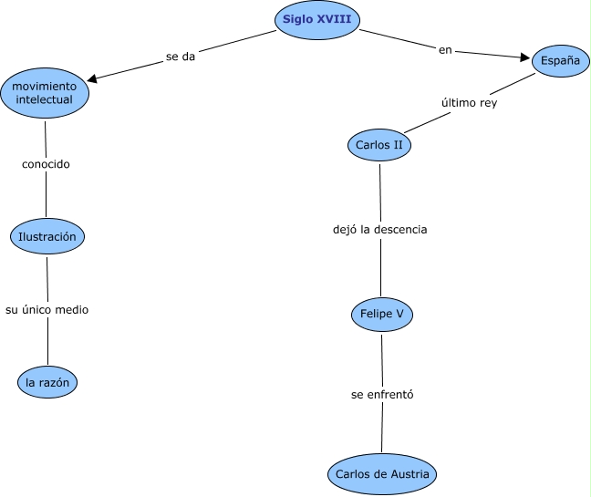 Este mapa conceptual tiene información relacionada a: siglo XVIII.14.marta fuentes, Ilustración su único medio la razón, Carlos II dejó la descencia Felipe V, Felipe V se enfrentó Carlos de Austria, España último rey Carlos II, Siglo XVIII en España, movimiento intelectual conocido Ilustración, Siglo XVIII se da movimiento intelectual